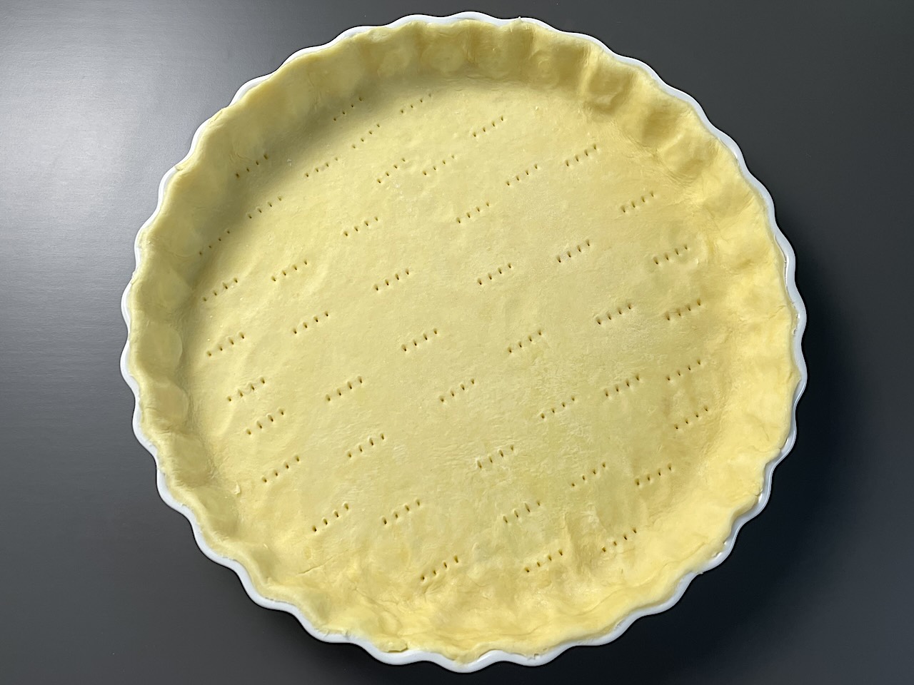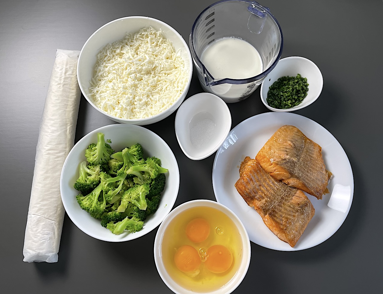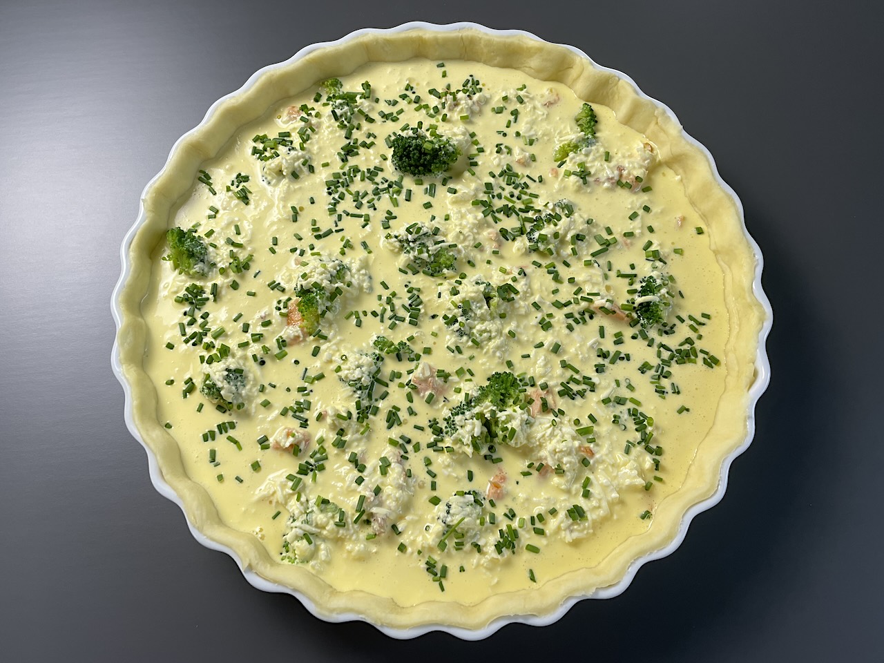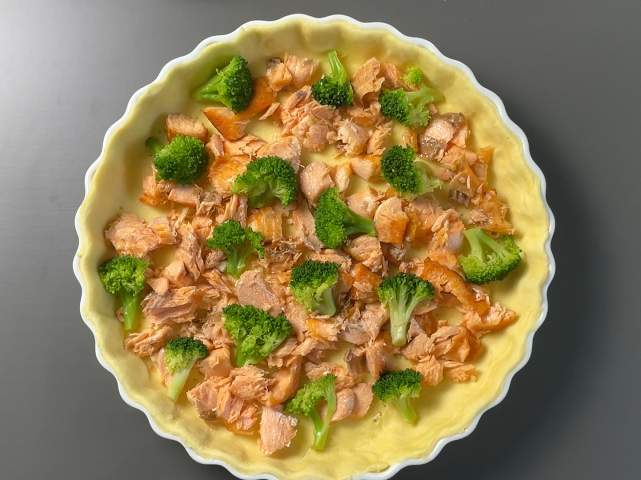 Roll out the shortcrust pastry on a baking dish and prick it all over with a fork. Evenly distribute the salmon pieces and broccoli florets over the pastry.