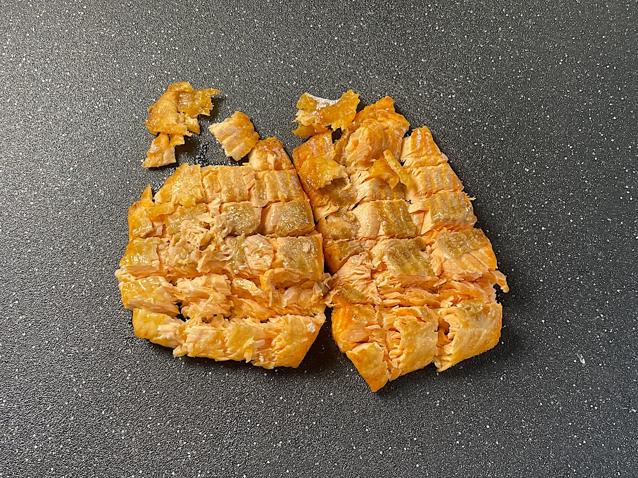 If you’re using fresh salmon, steam the salmon steak until it’s cooked through, or alternatively, you can use smoked salmon. Allow the cooked salmon to cool before cutting it into bite-sized pieces.