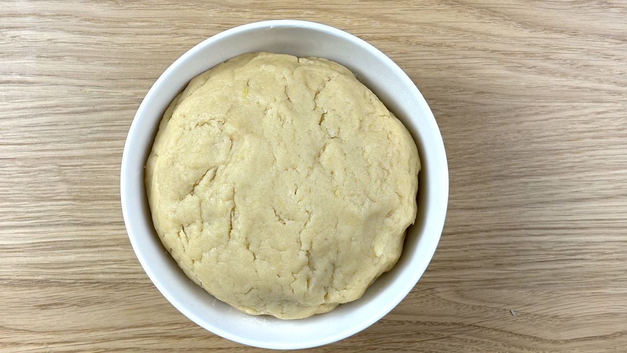 Add the room temperature butter and the egg, then mix until the dough comes together and can be shaped into a ball.