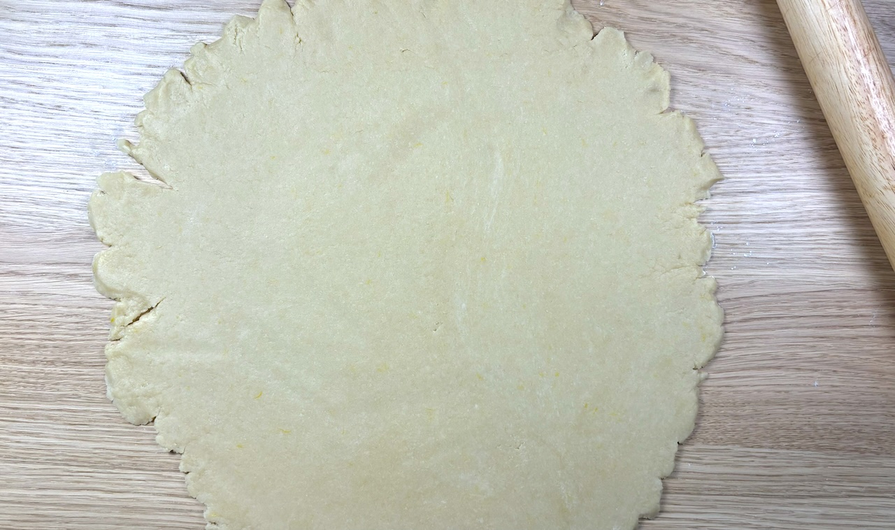 Then, roll out the dough on a floured surface to fit your pie dish, leaving an overhang around the edges.