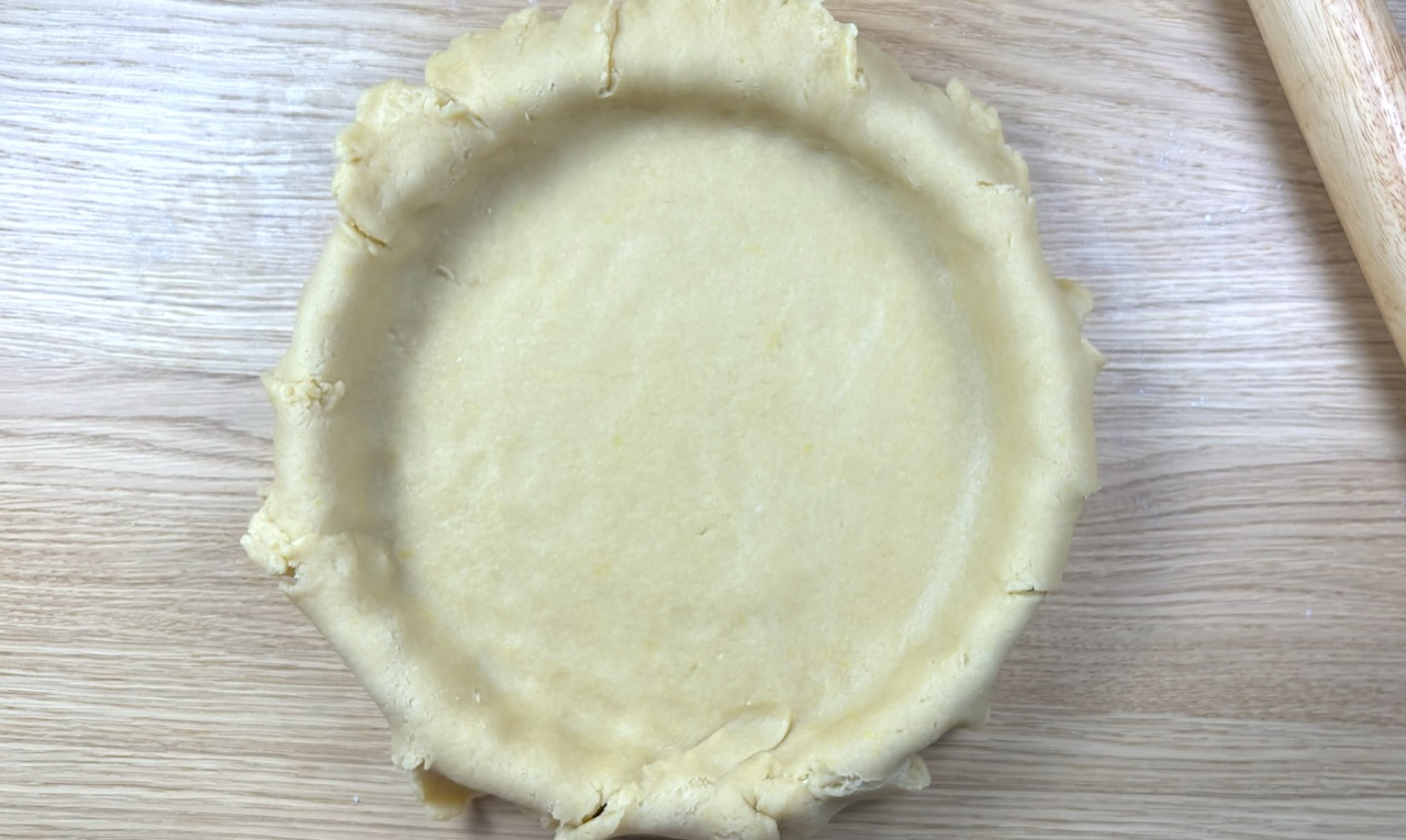 Transfer the rolled-out dough to the buttered and floured pie dish and press it gently into place.
