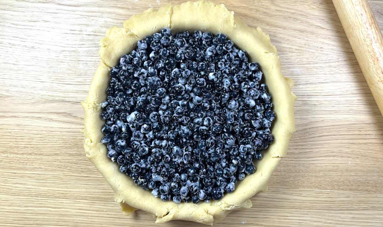 Pour the blueberry filling into the crust, spreading it out evenly. Fold the edges of the pie dough in towards the center as you go around.