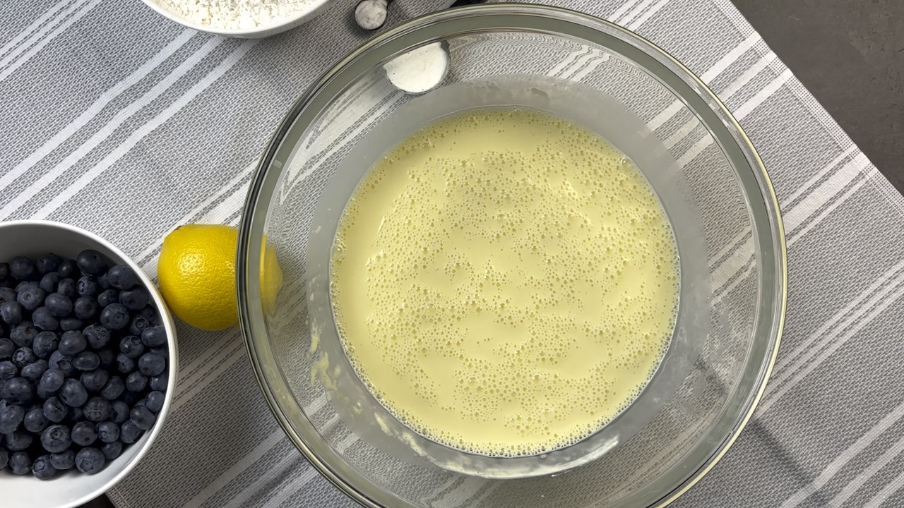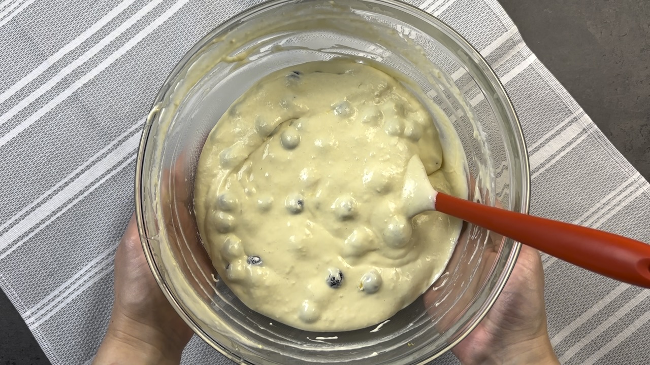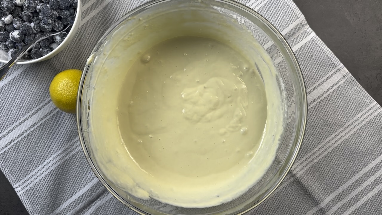 Zest the lemon and gently fold the blueberries into the batter until evenly distributed.