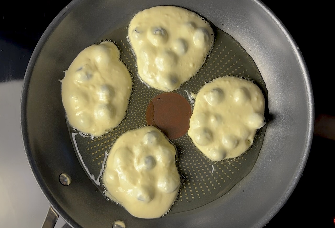 Using a large spoon, scoop a spoonful of batter onto the pan for each pancake. Cook until bubbles form on the surface and the edges look set, about 2-3 minutes. Flip the pancakes and cook for another 2-3 minutes, or until golden brown and cooked through.