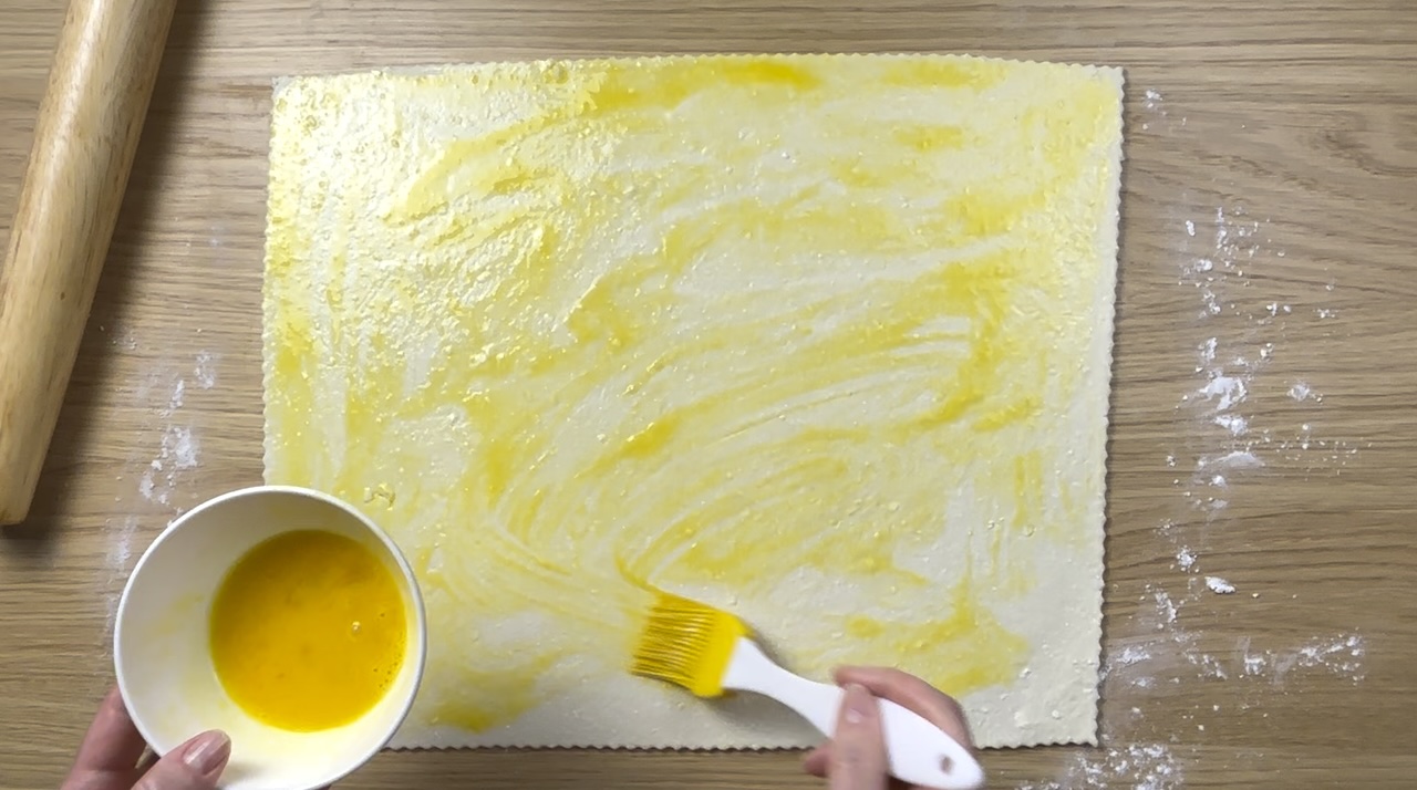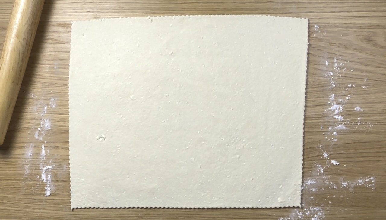 After an hour, remove the dough from the fridge and roll it out on a floured surface to a thickness of about 1.3 inch (3mm). Shape the dough into a rectangle.