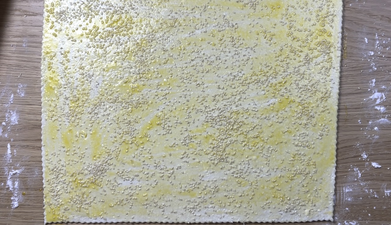 Beat the egg and brush it over the surface of the dough. Sprinkle coarse salt and sesame seeds evenly over the entire surface.