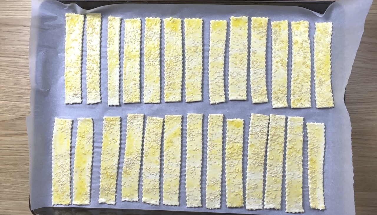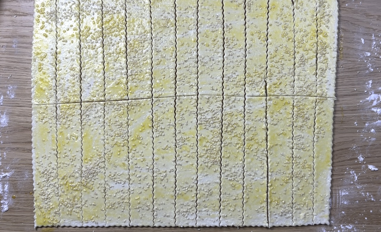 Using a sharp knife or a pastry cutter, cut the dough into strips that are 1 inch (2.5cm) wide and 6.5 inches (17cm) long.