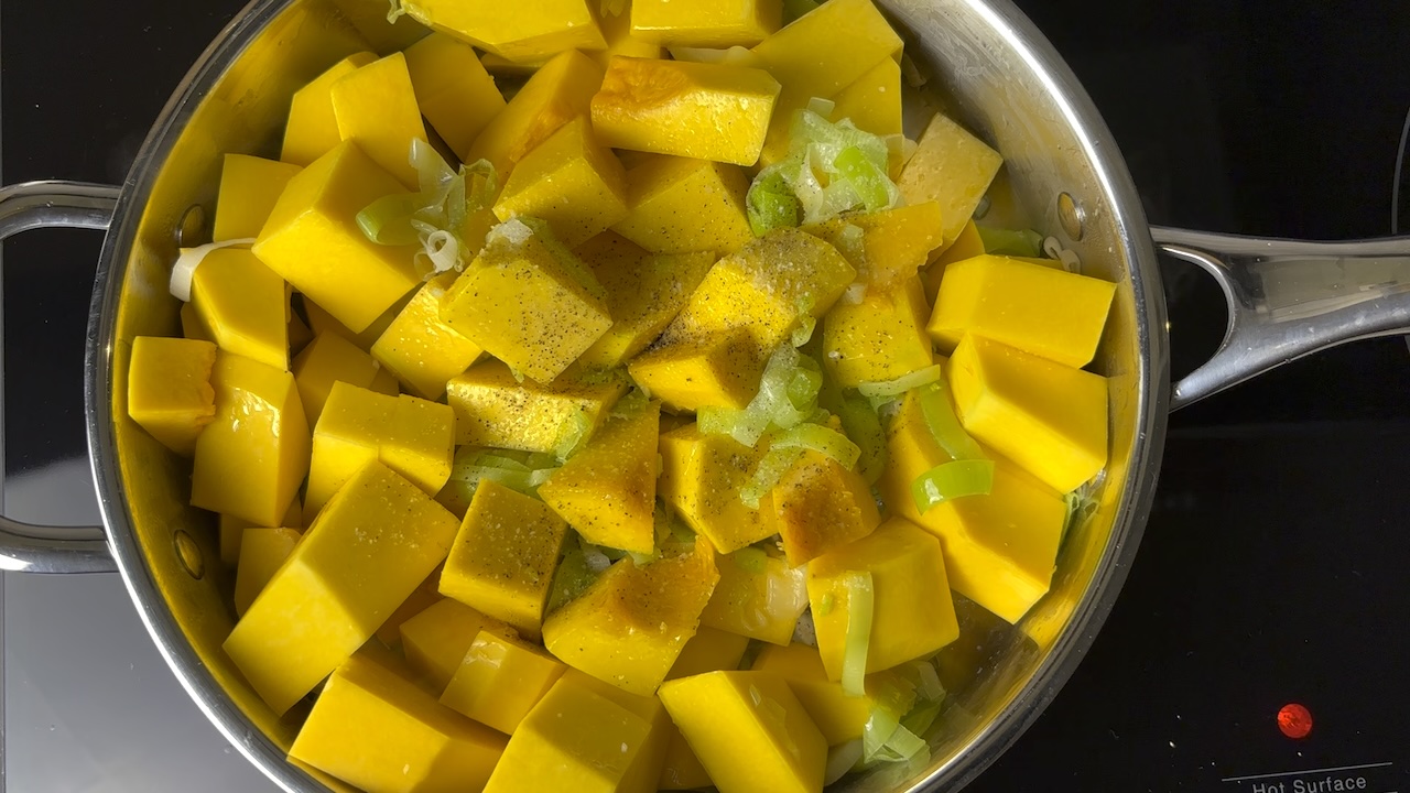 Add the cubed butternut squash to the pot with the leeks. Season with salt and pepper, then pour in the vegetable broth.