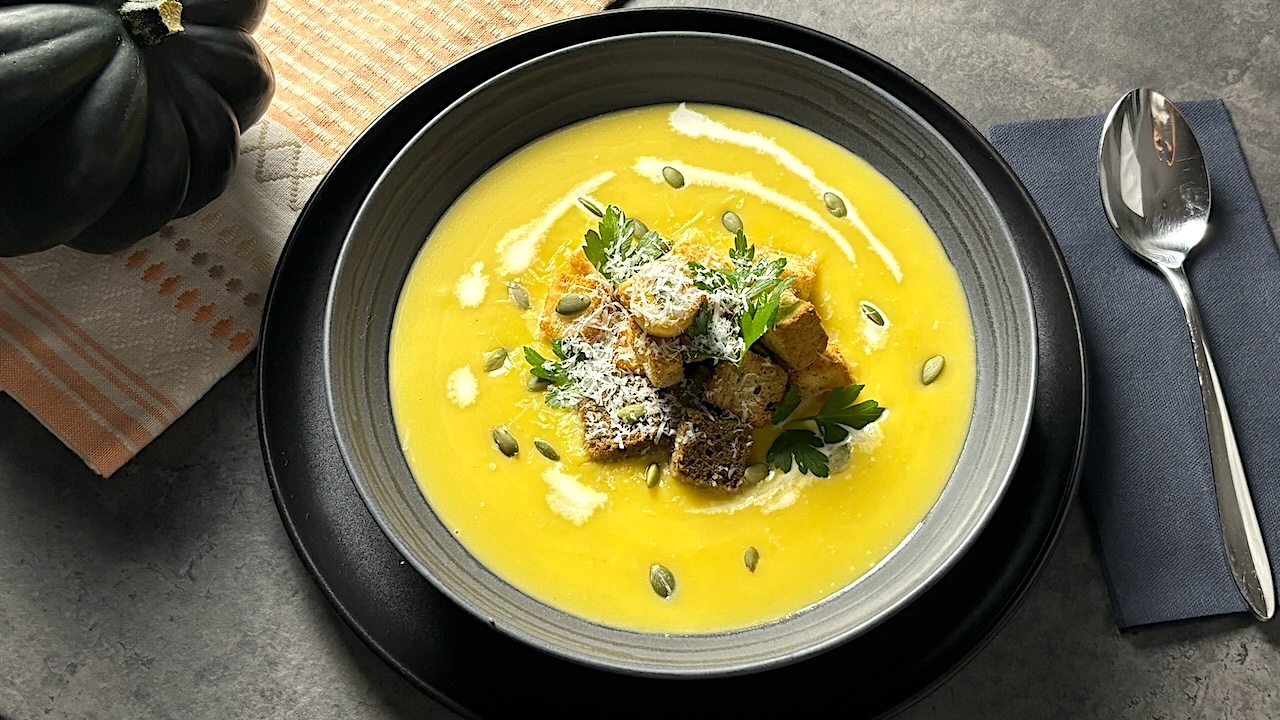 Enjoy a warm bowl of Creamy Pumpkin Soup, where the sweet flavor of butternut squash blends perfectly with sautéed leeks in a smooth, velvety base. A touch of cream adds richness, and the seasoning is just right to let the natural flavors shine. Topped with crunchy croutons, toasted pumpkin seeds, fresh parsley, and a sprinkle of Parmesan, this soup offers a satisfying mix of textures and flavors. It’s a comforting, simple dish that’s perfect for any cozy meal.