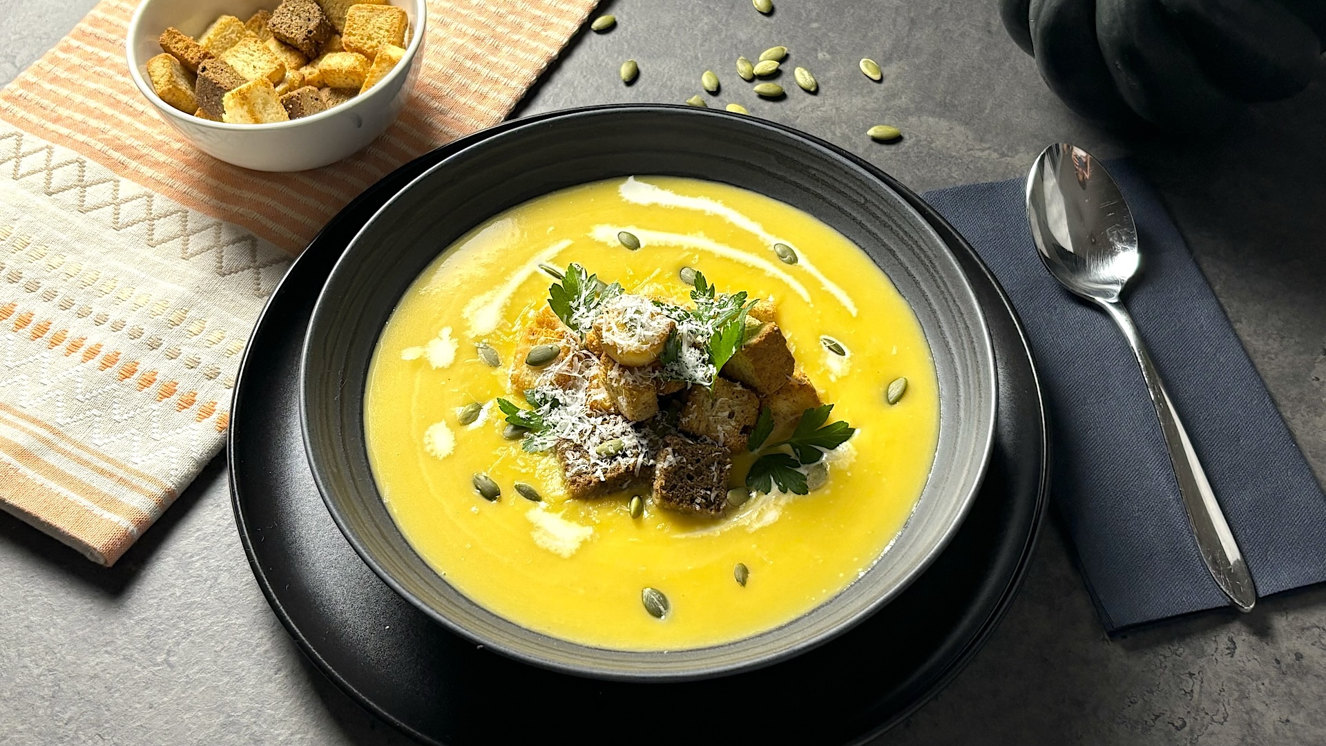 Garnish with seasoned croutons, parsley, pumpkin seeds, and a dusting of parmesan cheese.