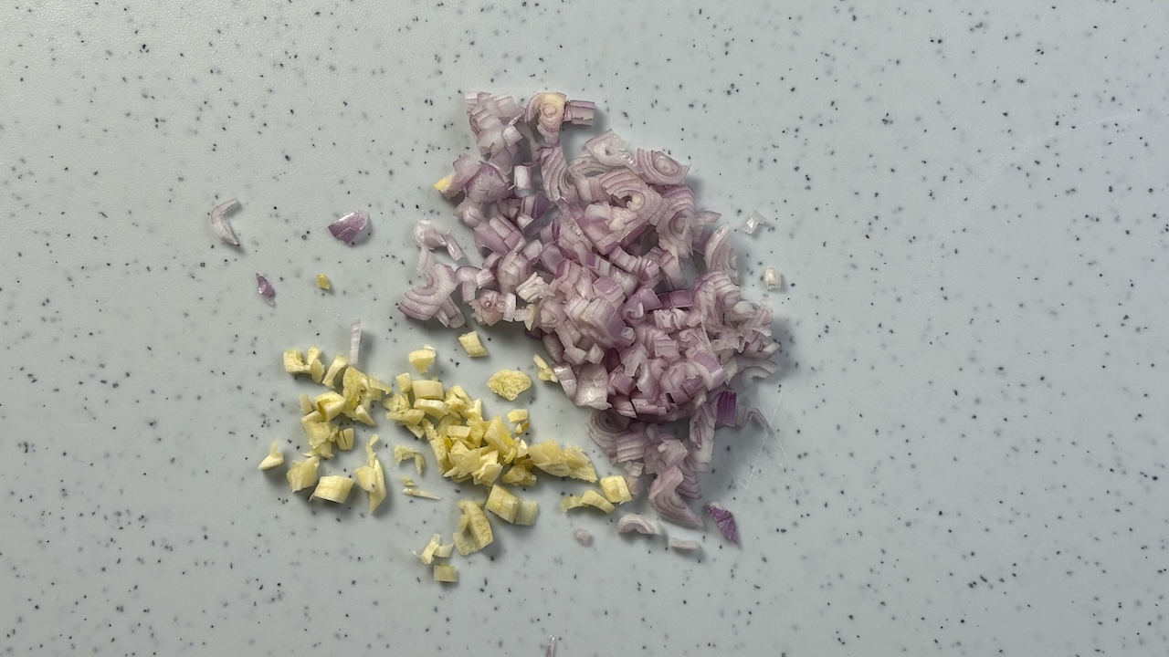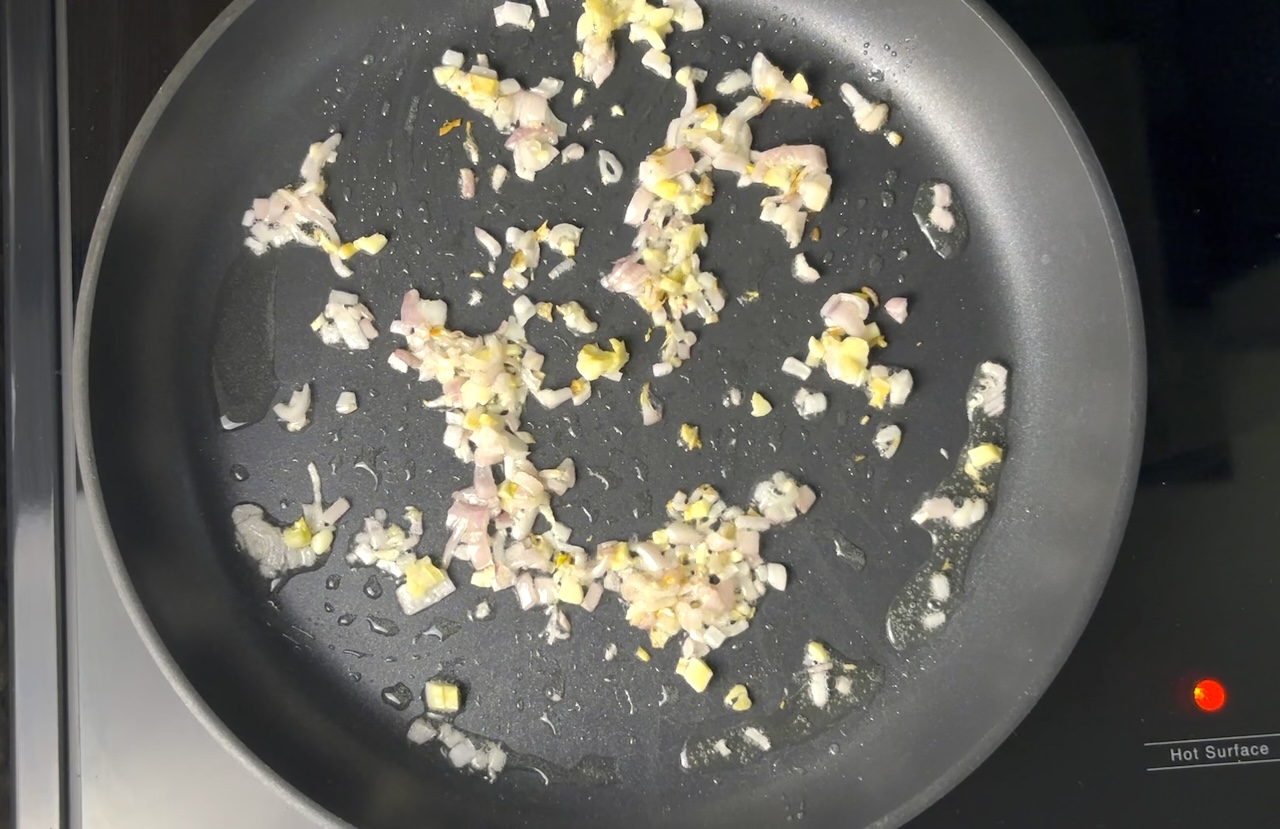 In a large frying pan, heat some vegetable oil over low heat. Add the chopped shallot and garlic, cooking for about 3-4 minutes until the shallot turns light golden.