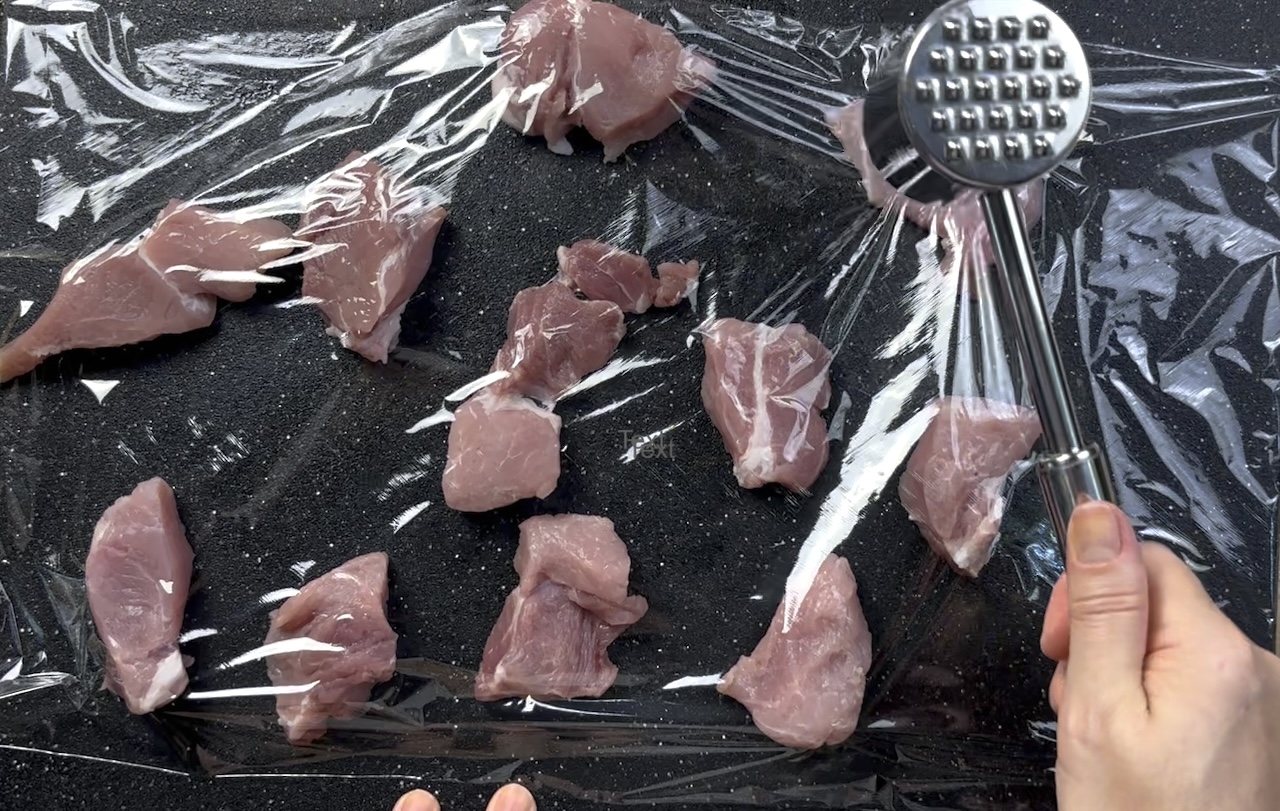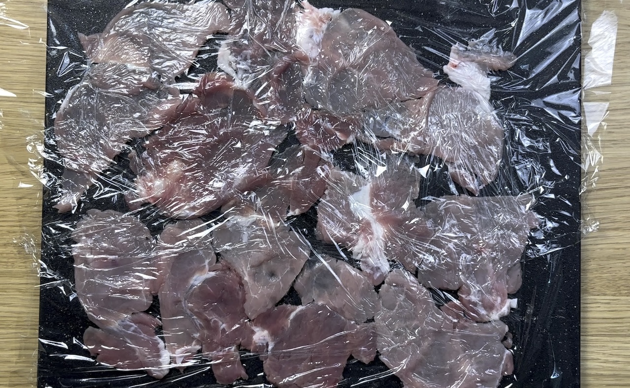 Cut the pork sirloin into smaller pieces and place them on a cutting board. Cover the pieces with plastic wrap and tenderize them with a meat mallet until thin and larger in size.