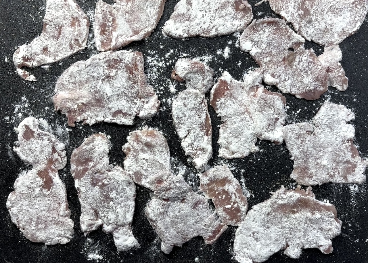 Season the tenderized pork with salt and pepper, then lightly coat both sides with flour.