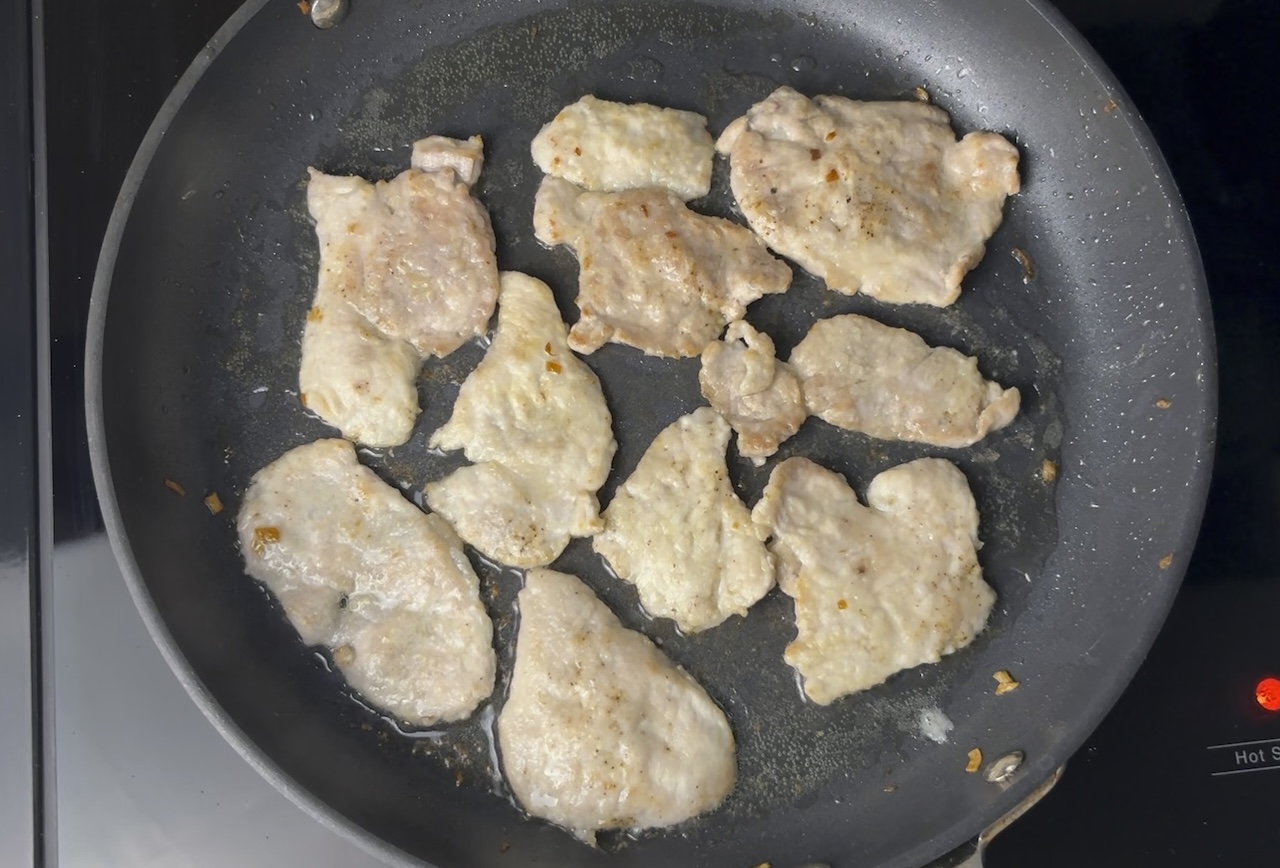 In the same frying pan used for the mushrooms, add more vegetable oil and fry the pork sirloin pieces over medium heat for about 2 minutes on each side until golden brown. Remove from the pan and set aside.