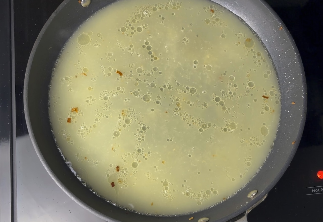 Pour the chicken broth into the pan and bring to a simmer, stirring to deglaze the pan and incorporate any browned bits from the meat.
