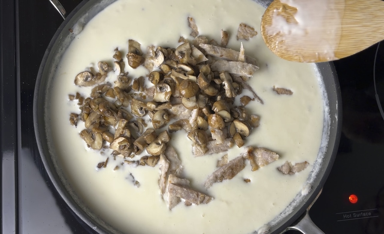 Slice the cooked pork into smaller pieces and return them to the pan along with the cooked mushrooms. Adjust the seasoning, lower the heat, and let the mixture cook for 10 minutes to allow the flavors to meld.