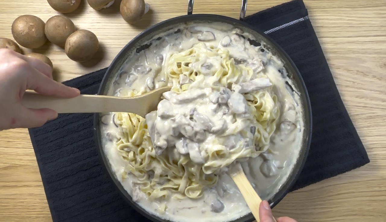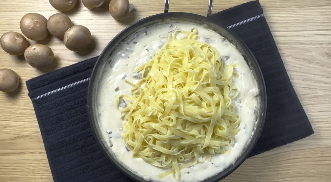Once the Tagliatelle is cooked, drain and add it to the pan with the sauce. Toss until the pasta is well coated.