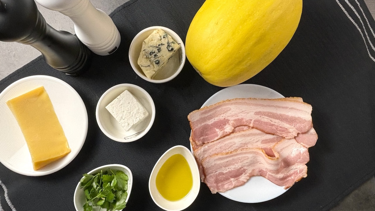 The dish starts with tender strands of roasted spaghetti squash, which provide a hearty, yet light, base. The squash is seasoned and topped with crumbled blue cheese and feta before roasting, allowing the cheeses to melt and infuse the squash with their rich, tangy flavors. Crispy bacon adds a smoky crunch, while grated Gouda, melted to perfection, contributes a creamy, indulgent texture. Garnished with fresh parsley, this dish combines comfort and sophistication, making it a perfect choice for a satisfying meal that’s both nutritious and flavorful.