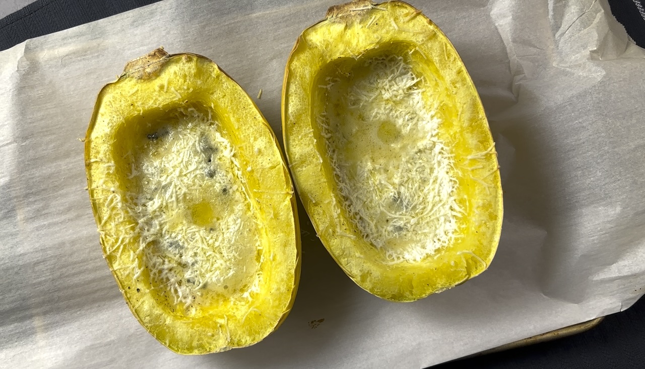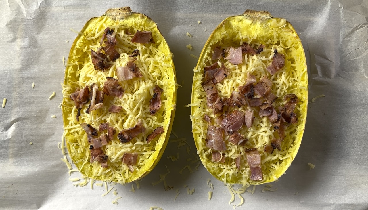 Grate the Gouda cheese evenly over the scraped strands then sprinkle with the crumbled bacon. Return the squash to the oven for another 5 minutes, or until the cheese is completely melted.