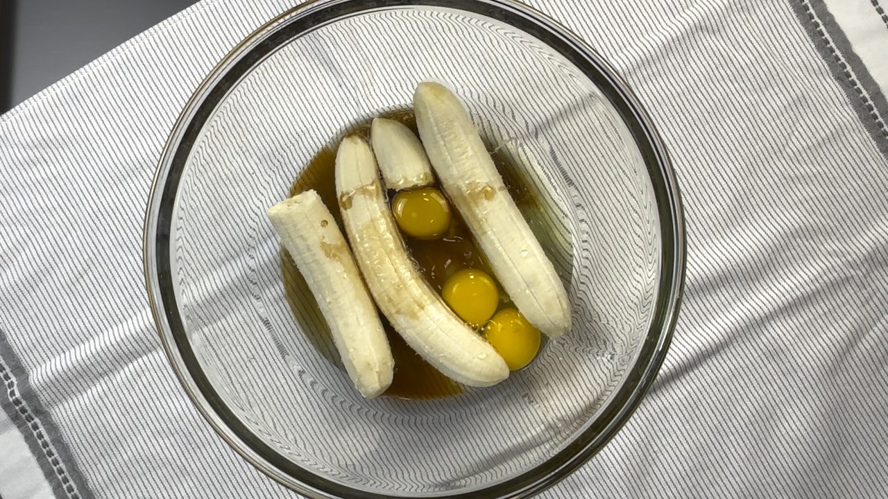 In a large bowl, add the ripe bananas, the eggs, vanilla, and the maple syrup.