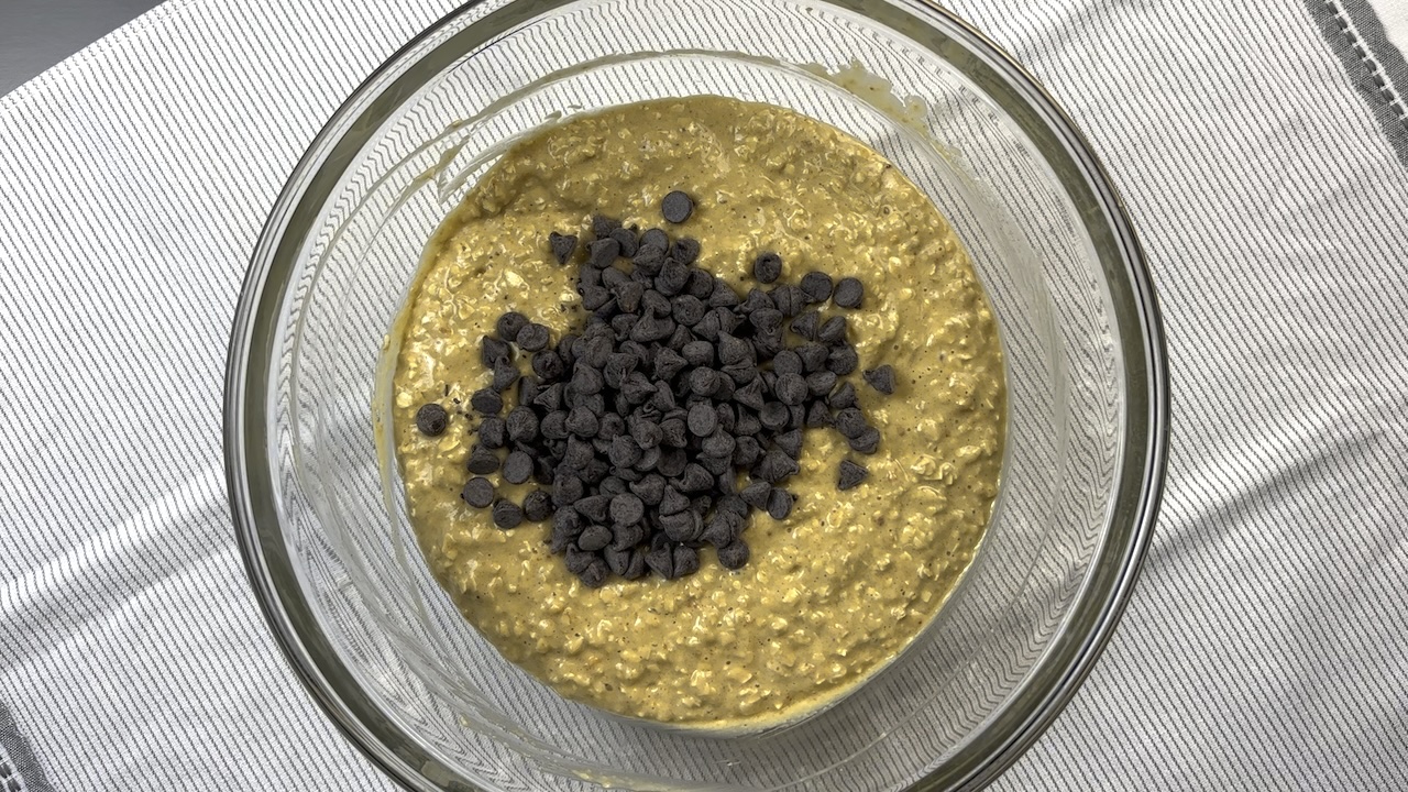 Add the dry ingredients to the wet ingredients, stirring until just combined, then fold in the chocolate chips until evenly distributed throughout the batter.