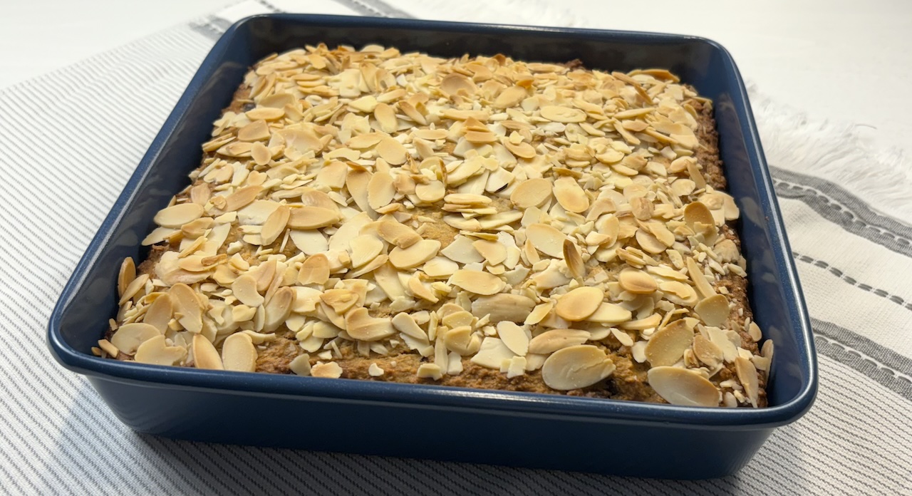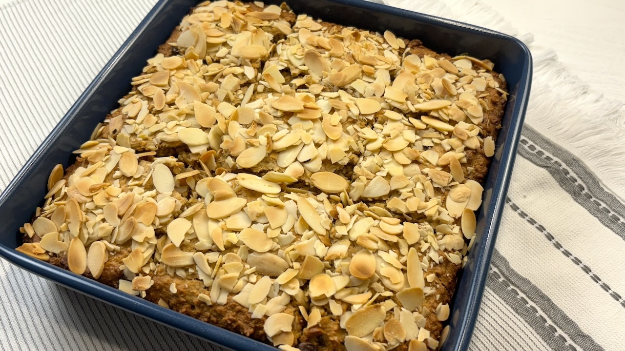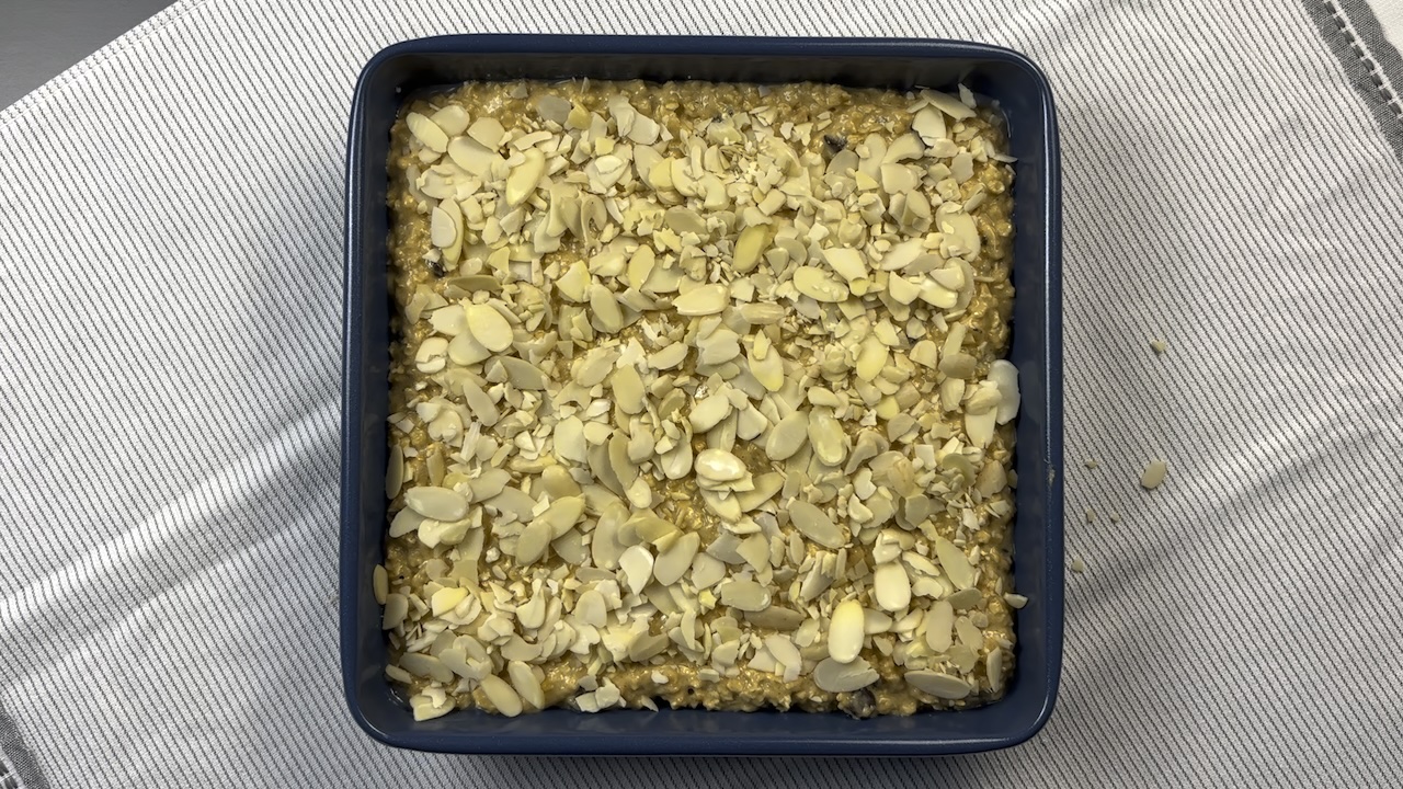 Sprinkle the sliced almonds evenly over the top of the batter.