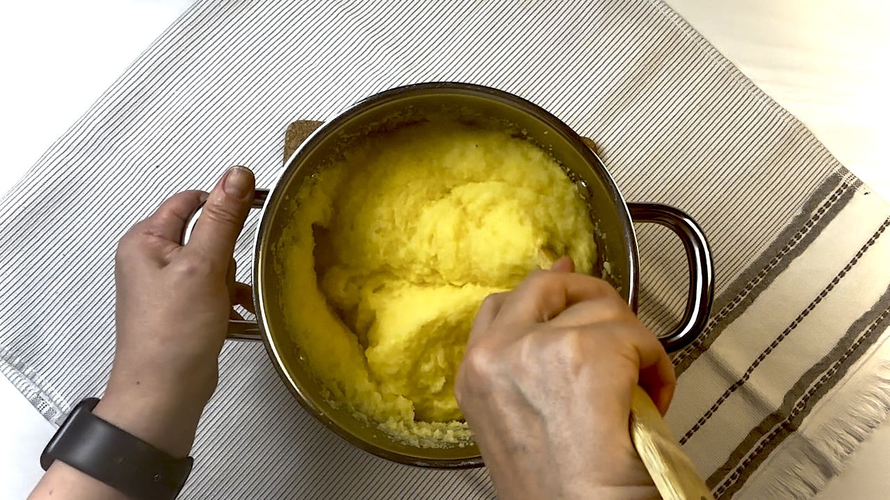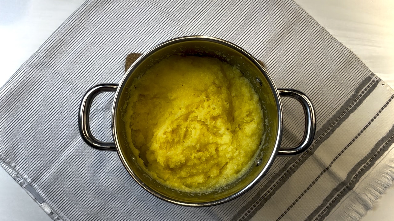 Once the polenta is smooth and thick, stir in the butter and season with additional salt to taste. Remove from heat and set aside.