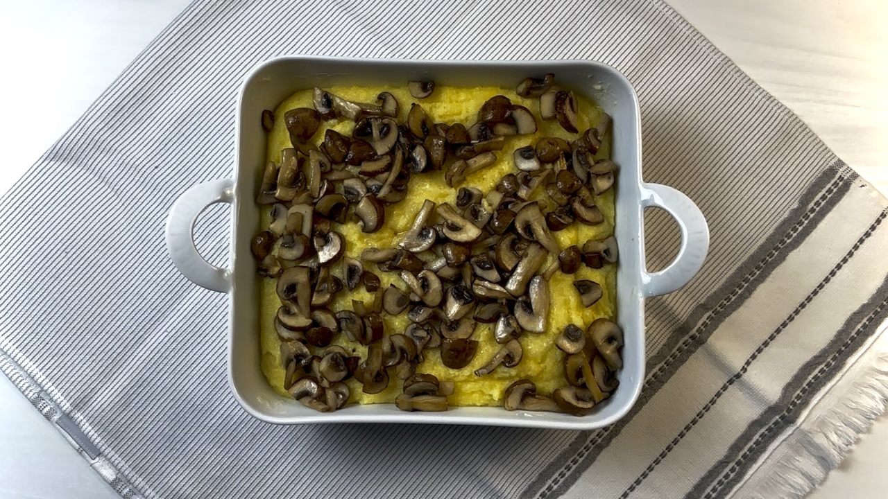 Let the casserole rest for 5-10 minutes before slicing. Serve warm and enjoy the creamy combination of polenta, mushrooms, and smoked cheese.