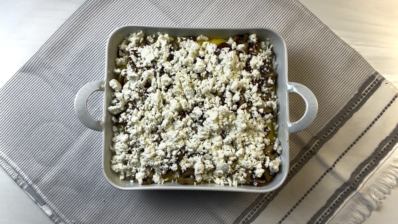 Spread the sautéed mushrooms evenly over the polenta, followed by a layer of crumbled feta cheese.