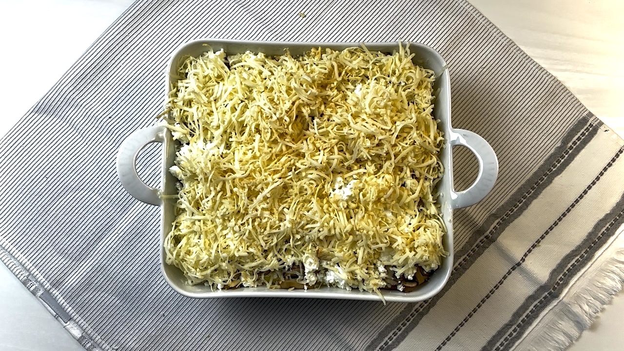 Grate the smoked cheddar cheese and sprinkle it over the mushrooms. Place the casserole in the preheated oven and bake for 15-20 minutes, or until the cheese on top is melted and golden brown.
