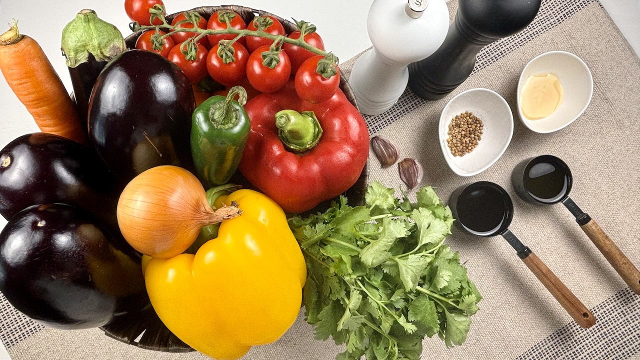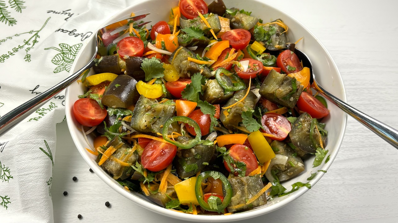 Meet my go-to Savory Eggplant Salad—a dish that’s light, fresh, and packed with flavor! Tender eggplant is paired with crunchy peppers, sweet grape tomatoes, and a hint of heat from jalapeño, all tossed in a simple, zesty dressing. The fresh cilantro and coriander give it a burst of brightness, making it perfect as a side for any meal or even on its own. This salad is one of those easy, no-fuss recipes that always feels wholesome and satisfying. It’s a favorite in my kitchen, and I hope it becomes one in yours too!