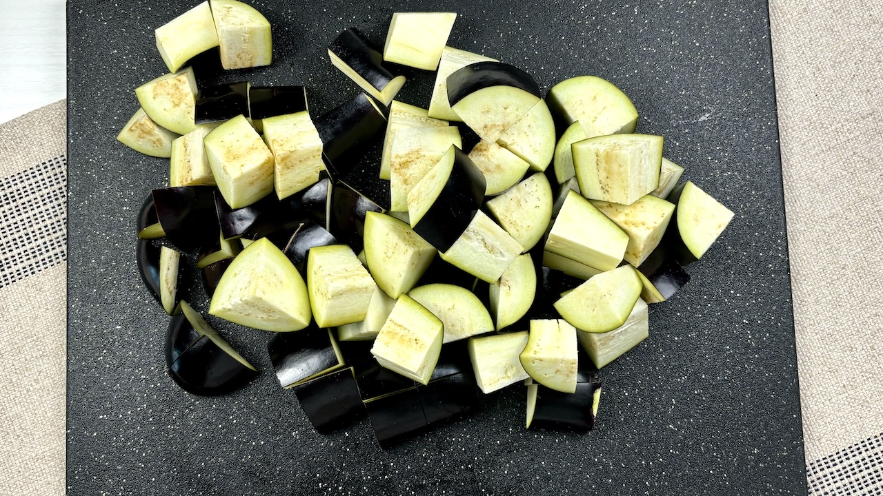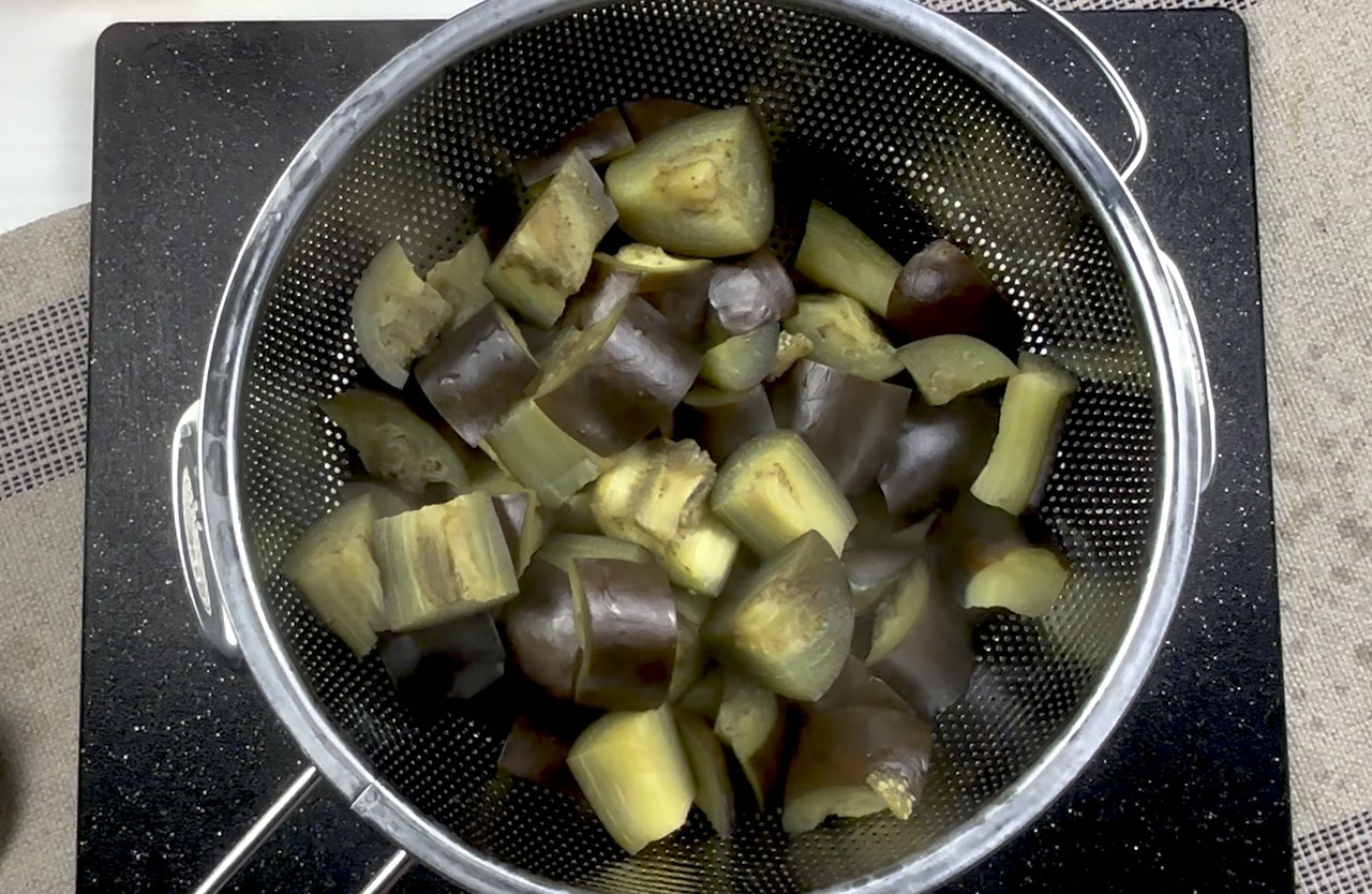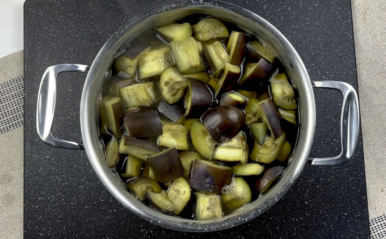 Begin by preparing the eggplants. Chop them into bite-sized cubes, then cook them in boiling water with a pinch of salt for 5 minutes. Remove from the water, drain, and allow them to cool.