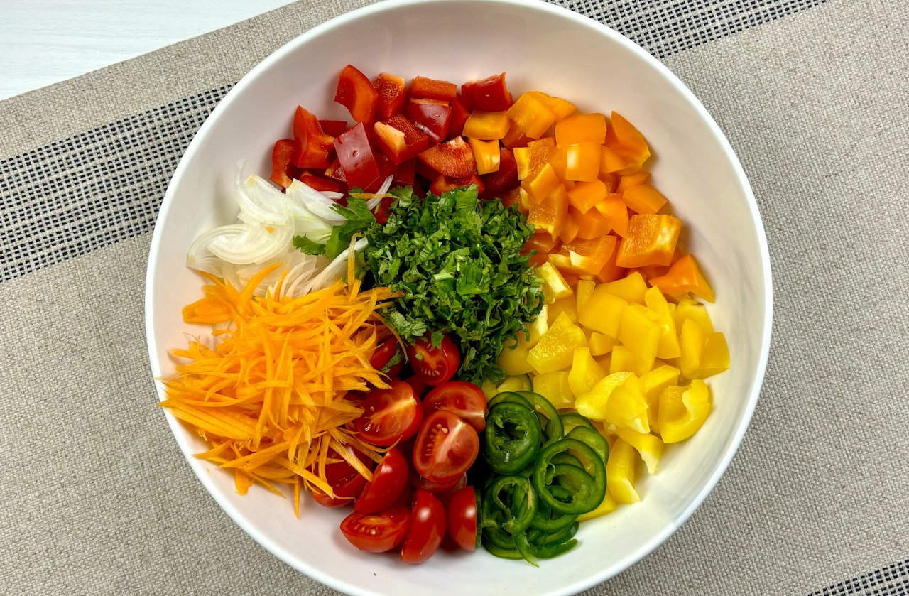 While the eggplants are cooling, prepare the vegetables. In a large serving bowl, dice the sweet bell peppers into uniform cubes, finely slice the onion and jalapeño pepper, grate the carrot using a regular or peeler grater to create longer strips, dice in half the tomatoes, and chop the cilantro.