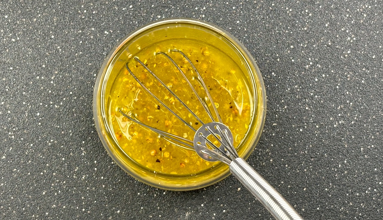 Next, make the dressing. In a small bowl, whisk together the olive oil, apple cider vinegar, honey, ground coriander, and minced garlic. Season with salt and pepper to taste.