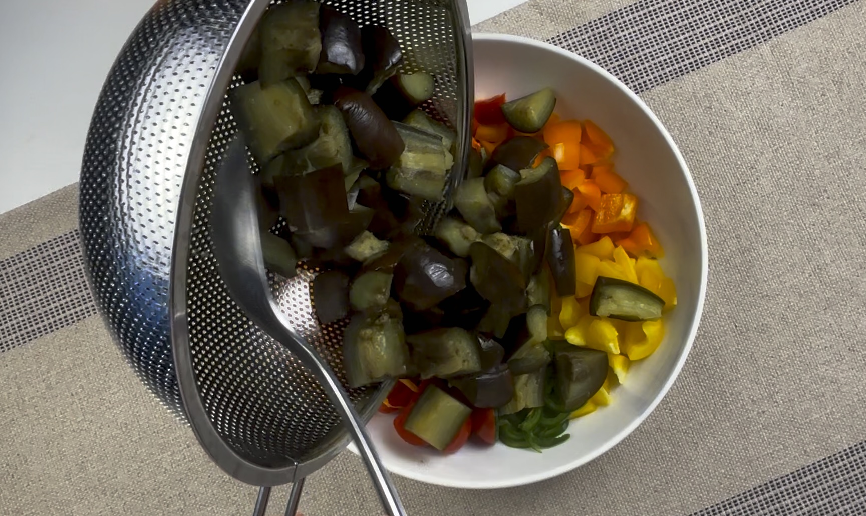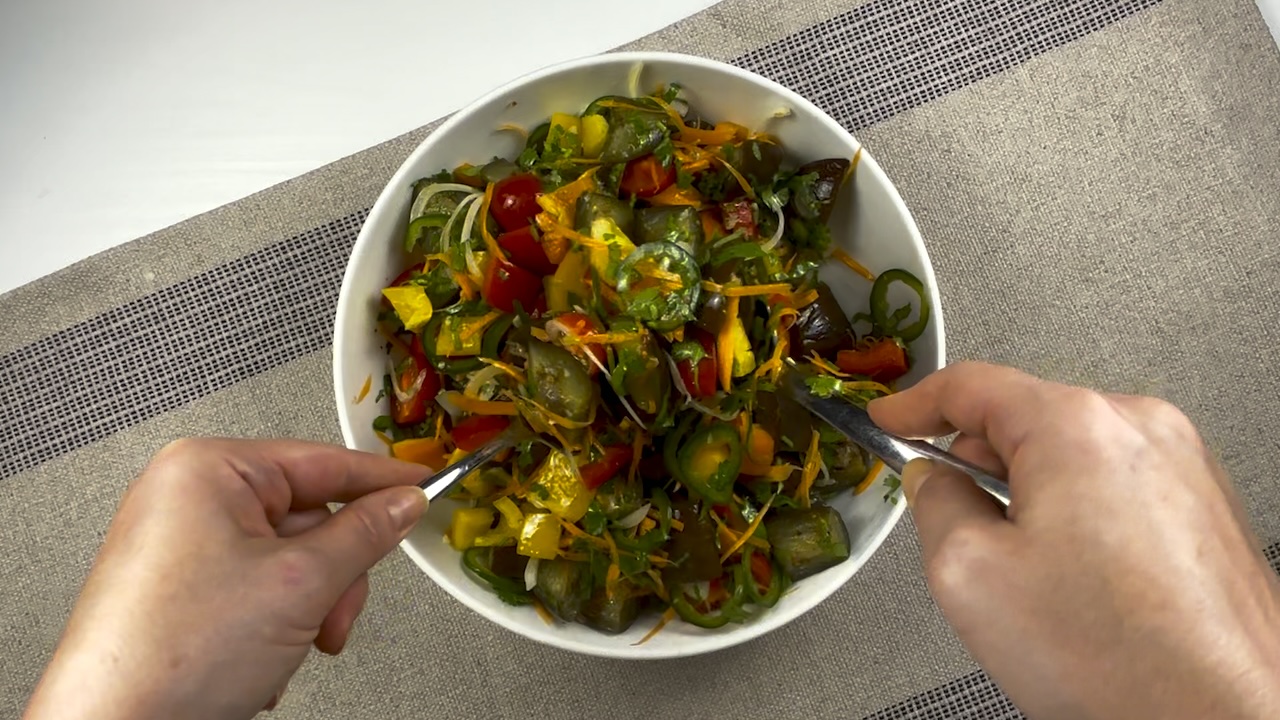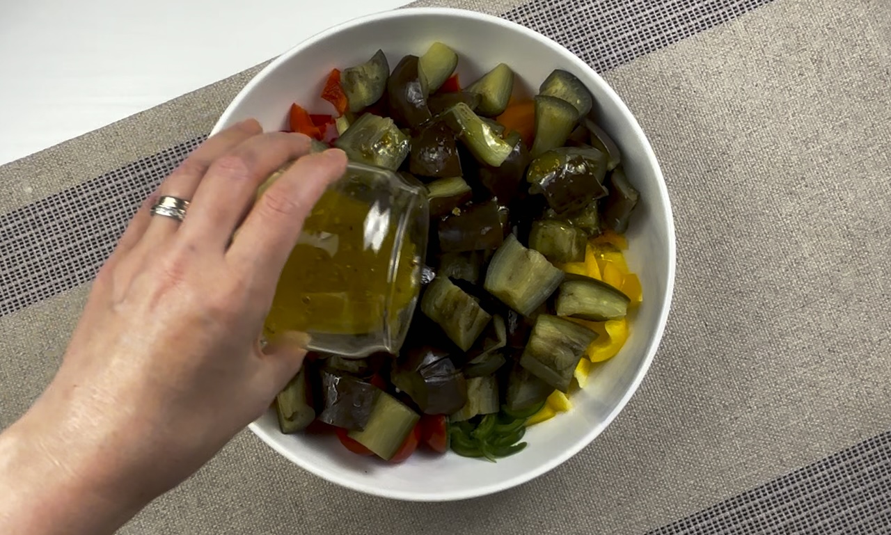 Add the cooled eggplant to the diced vegetables, drizzle the dressing over the salad, and toss everything together until well coated.