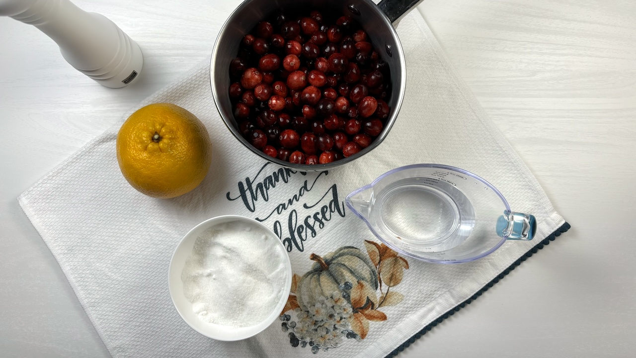 In a medium saucepan, combine the rinsed cranberries, sugar, water, orange zest, and orange juice. Stir to combine all the ingredients well.