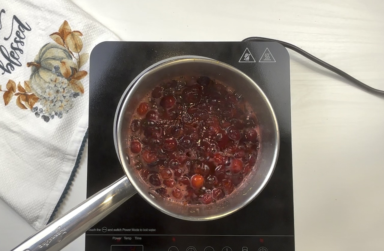 As the cranberries heat up, they will begin to pop and release their juices. Continue to simmer for about 10–15 minutes until the sauce thickens and most of the cranberries have burst.
