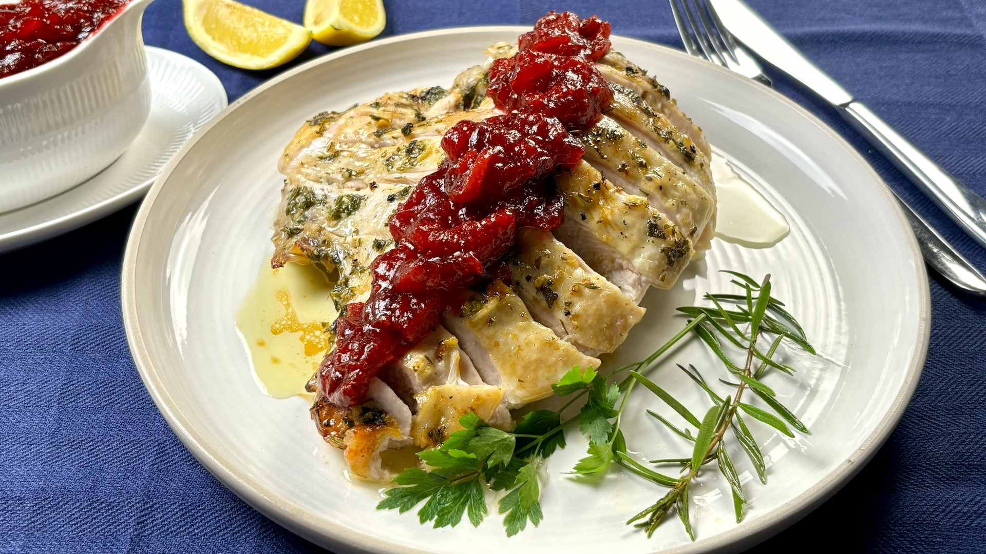 Check out my delicious Herb-Infused Butter Roasted Turkey Breast recipe shown above! It’s the perfect pairing for this cranberry sauce and will make your meal unforgettable!