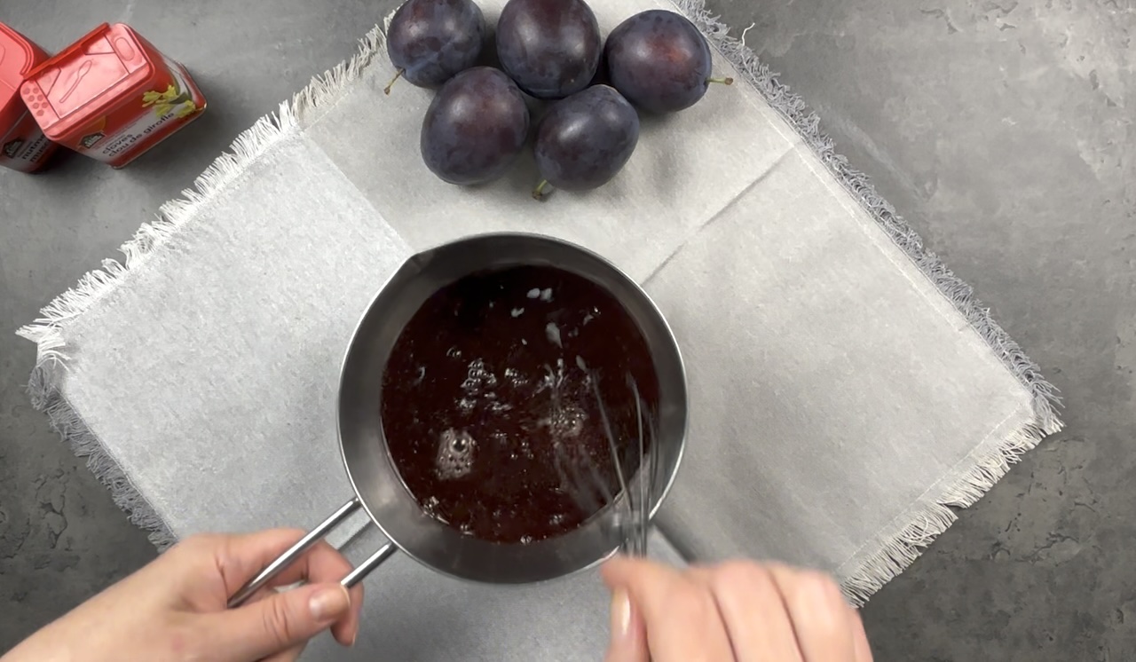 Cube the plums and add them to the cooled wine syrup. Let them marinate for 30 minutes.