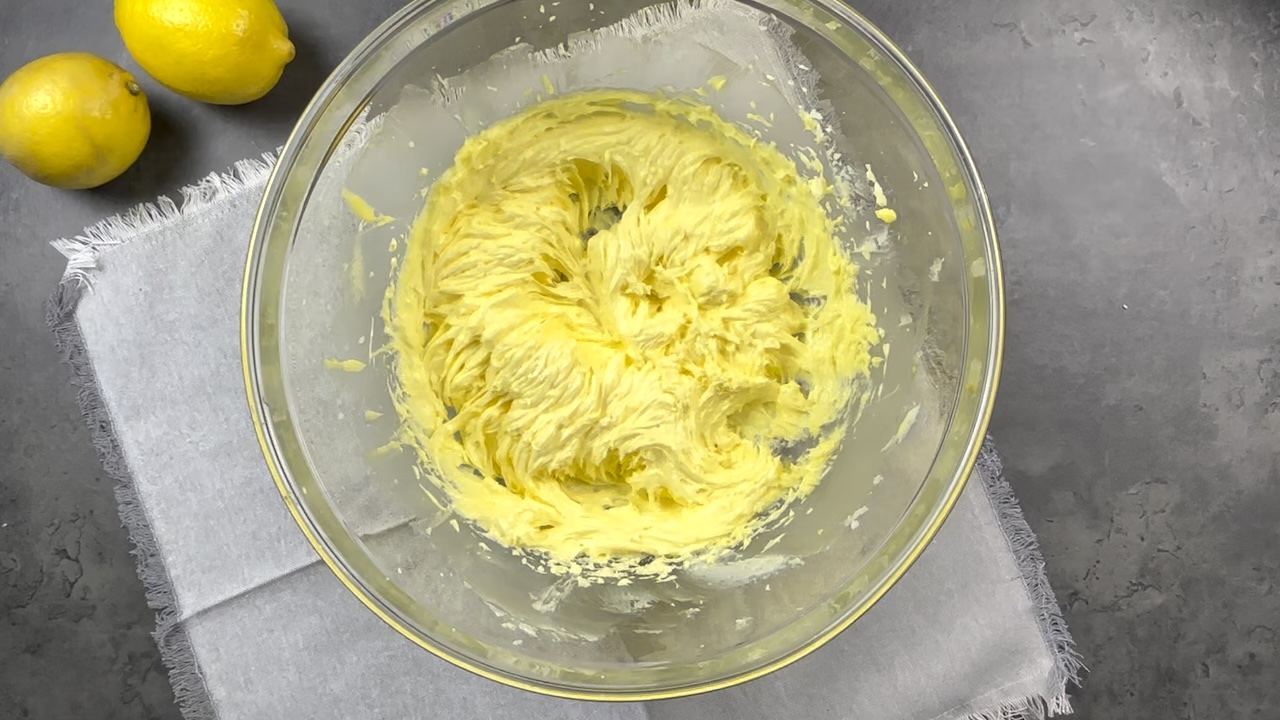 In a separate mixing bowl, add the butter and half of the sugar. Mix until the butter becomes fluffy, then incorporate the egg yolks one at a time.