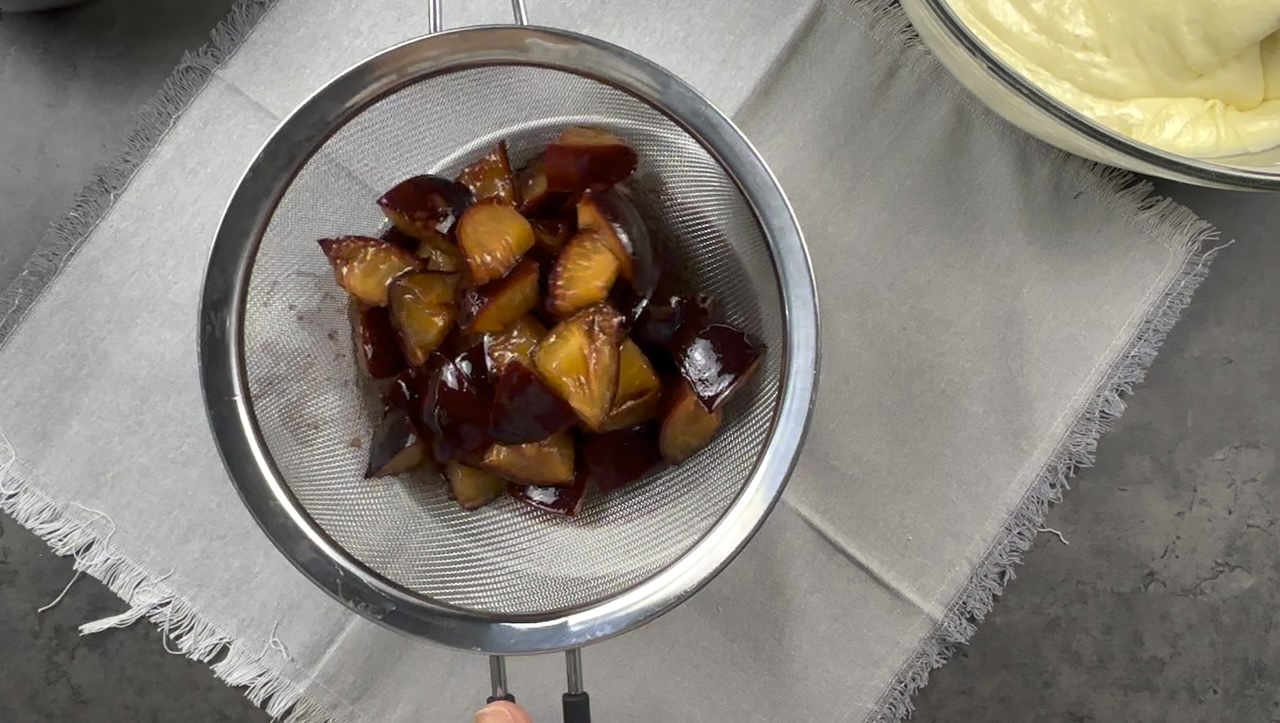 Using a strainer, drain the plums to remove excess syrup, then coat them with 1 tablespoon of flour.
