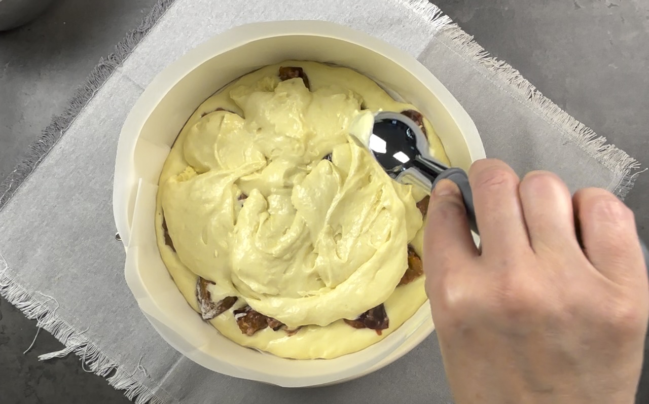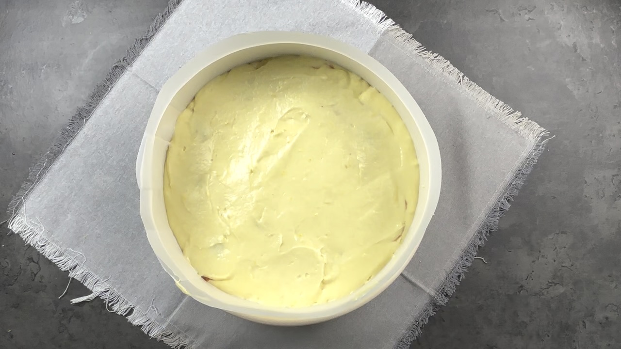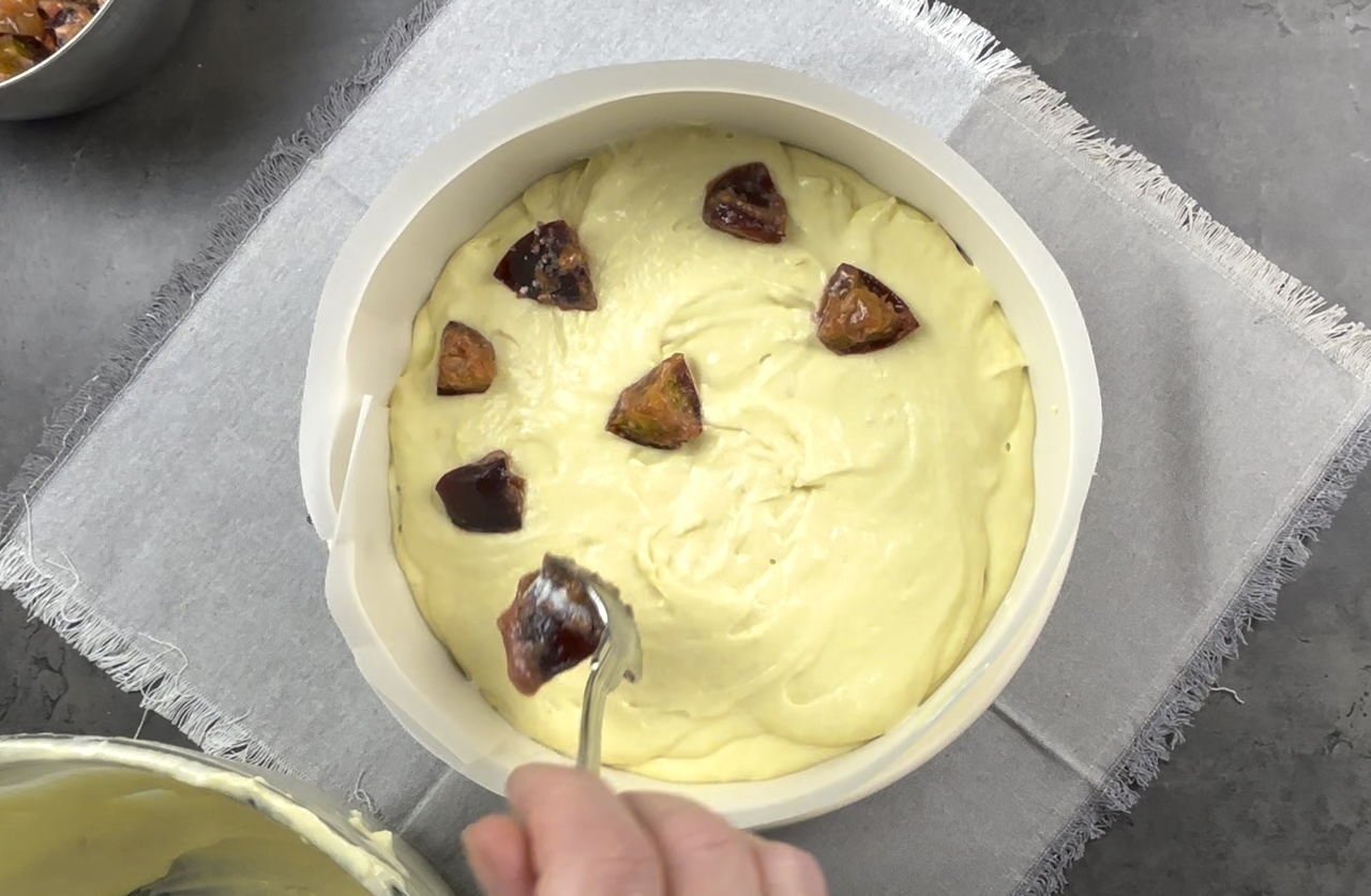 Pour one-third of the batter into a 9-inch (22cm) springform pan lined with parchment paper. Evenly spread half of the plums over the batter.