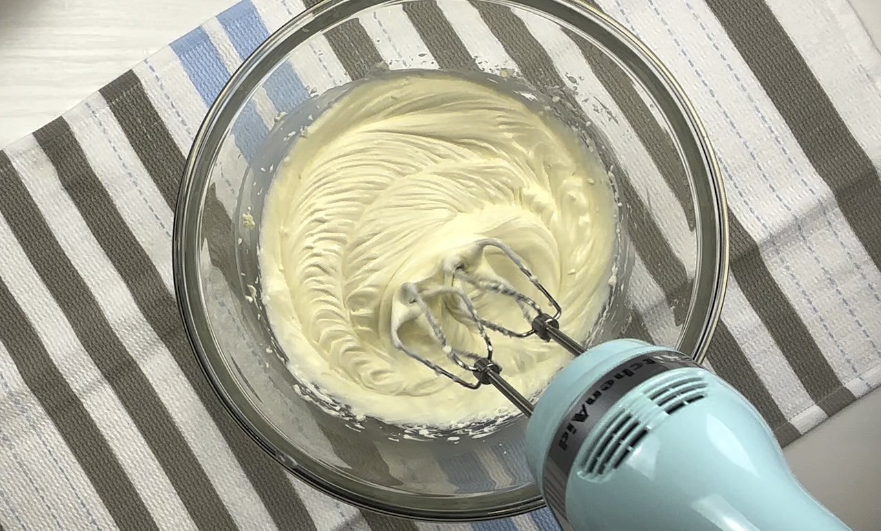 In a large bowl, beat the cream cheese and powdered sugar until smooth. Add the remaining cream and beat until firm.