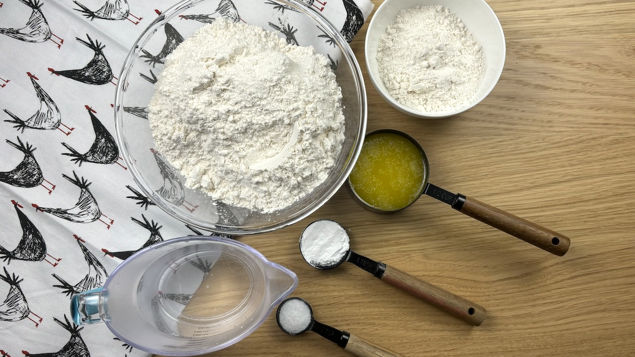- 3 cups (360g) white flour + 1/3 cup (40g) for dusting