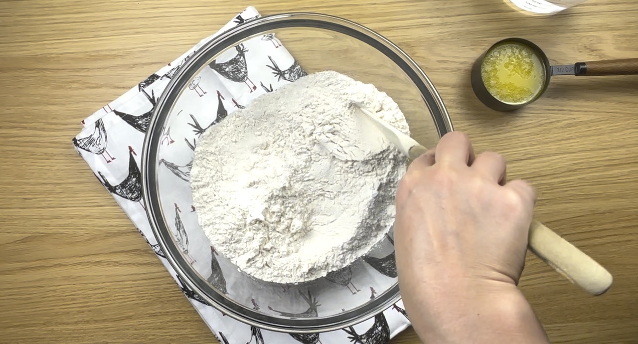 Create a well in the center of the dry ingredients and pour in the hot water and melted butter.