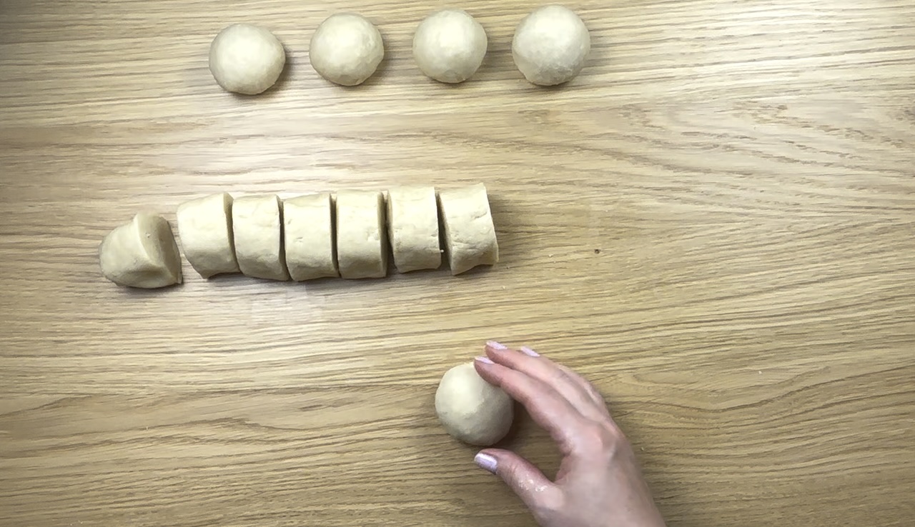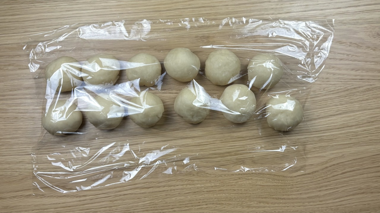 Divide the dough into 12 equal portions of approximately 62g each and roll each portion into a ball.