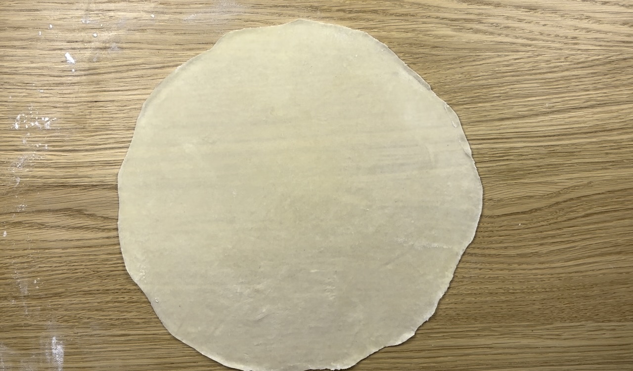 After resting, take one dough ball at a time and flatten it slightly. On a lightly floured surface, use a rolling pin to roll each ball into a thin circle, about 10-11 inches (27-28 cm) in diameter, keeping the thickness as even as possible.