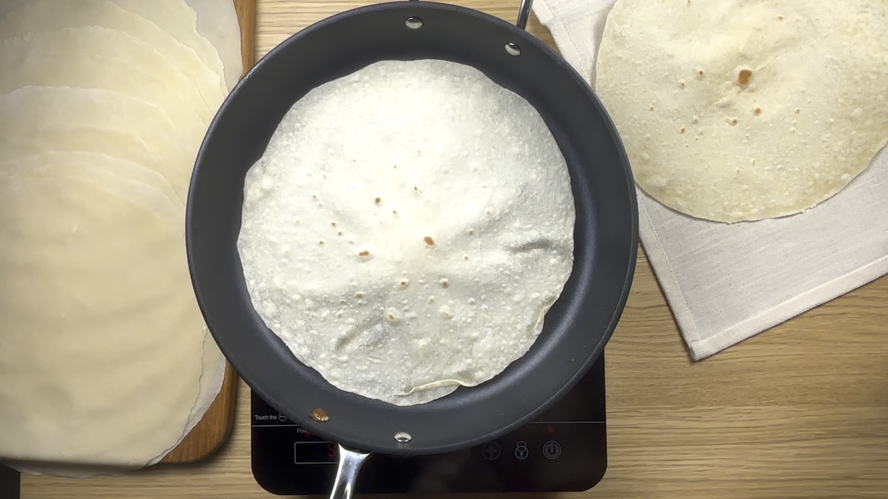Preheat a skillet or griddle over medium-high heat. Once hot, place the rolled tortilla on the skillet and cook for about 30 seconds on each side, or until lightly browned and puffed. Repeat this process for the remaining tortillas, stacking them on a plate and covering them with a towel to keep warm.