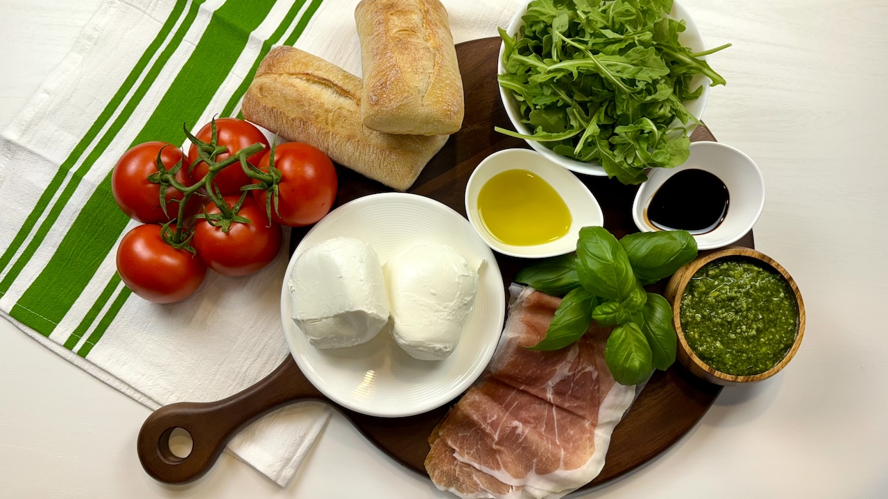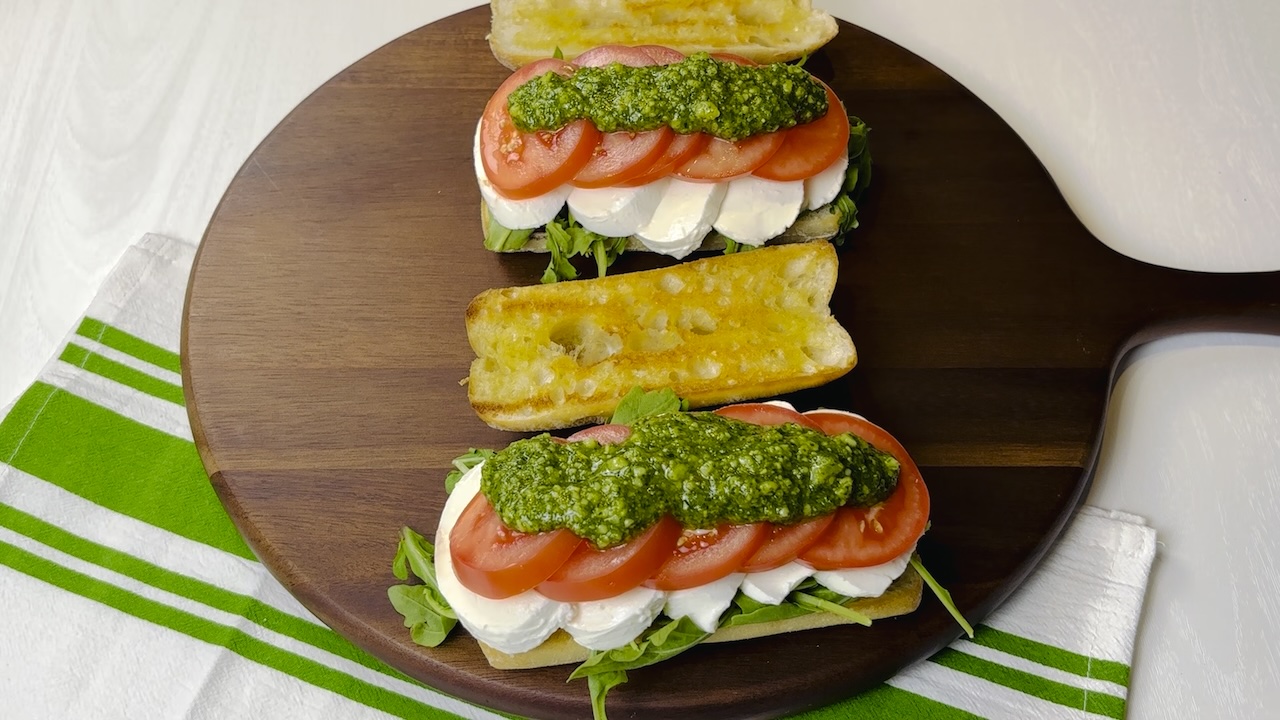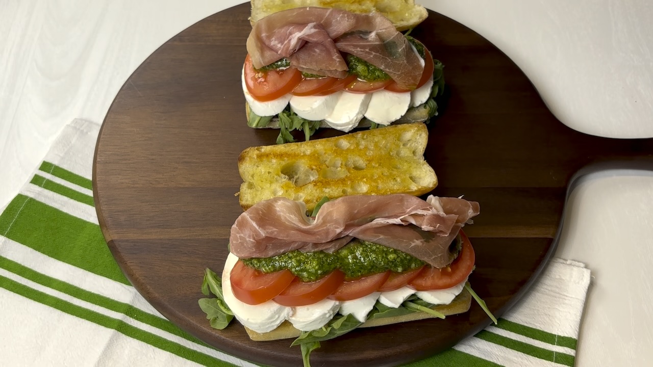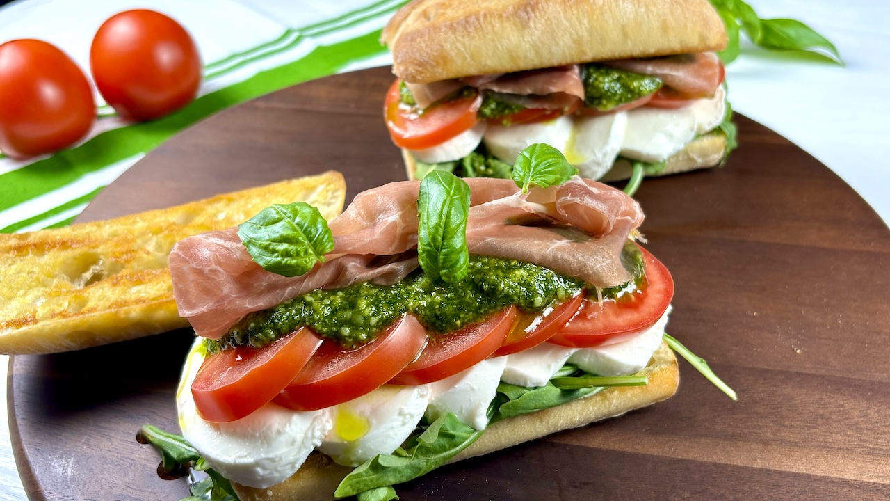 This Cappers Sandwich with Prosciutto is a satisfying blend of Italian flavors layered within a perfectly toasted ciabatta roll. The sandwich begins with crisp, peppery greens, topped with a drizzle of rich balsamic for a hint of acidity that cuts through the creaminess to come. A layer of fresh, mild cheese adds a silky contrast, followed by juicy, ripe tomatoes that bring a burst of sweetness. The heart of the sandwich lies in a generous spread of pesto, offering a fragrant basil and garlic note that harmonizes with the salty, tender slices of cured prosciutto. A touch of fresh basil completes the creation, adding a final pop of color and aroma. Each bite is a delightful combination of textures—crunchy, creamy, juicy, and tender—making this sandwich a flavorful, hearty meal that’s perfect for any time of day.