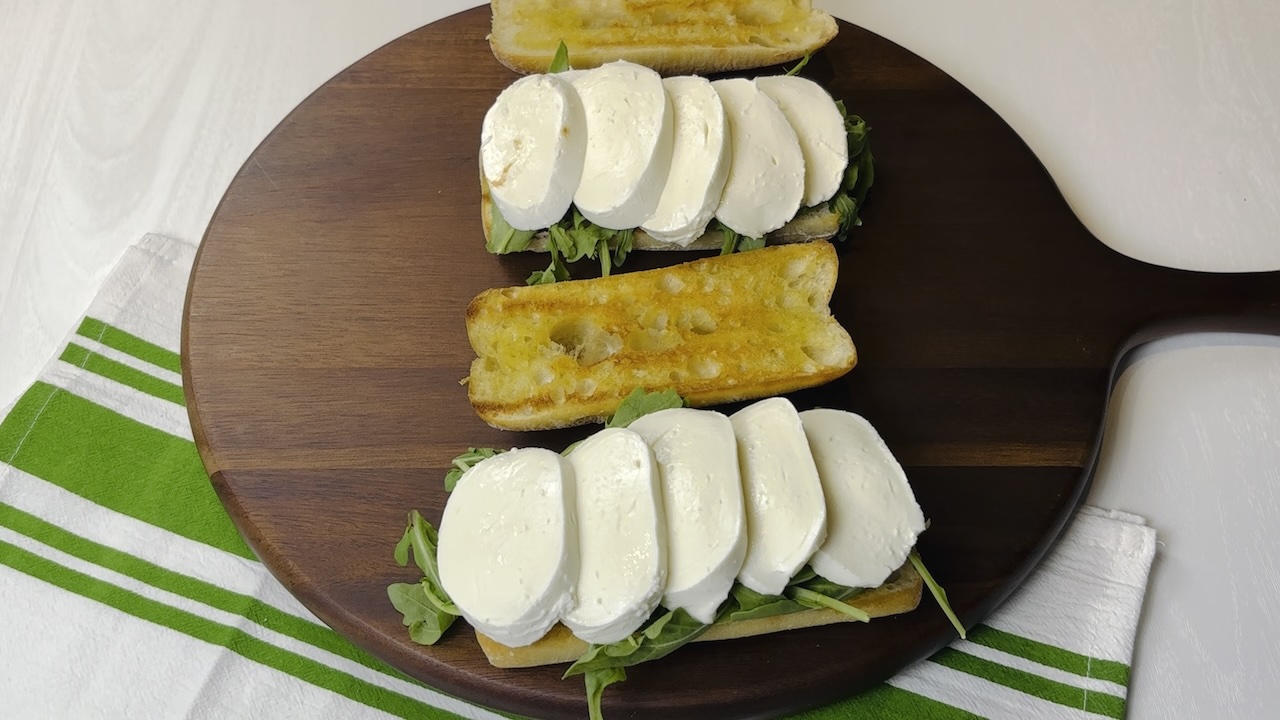 Layer the fresh mozzarella slices on top of the arugula, spacing them evenly to cover the greens. The creamy mozzarella will add a wonderful contrast in texture and flavor.
